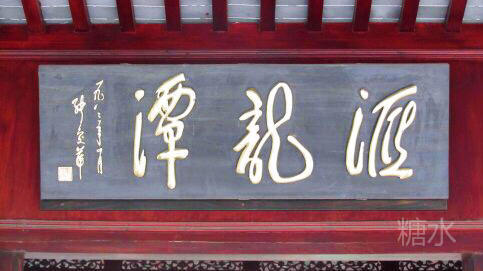 “汇龙潭”,悬于畅观楼北檐下公园正门。行草体,长3米、宽0.8米,堆煤底金字。1983年4月张爱萍书。