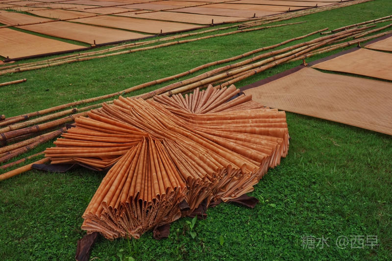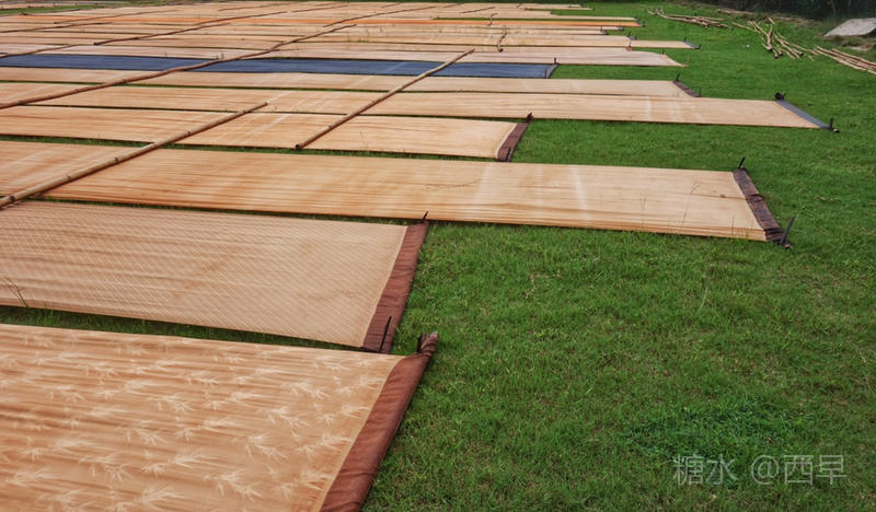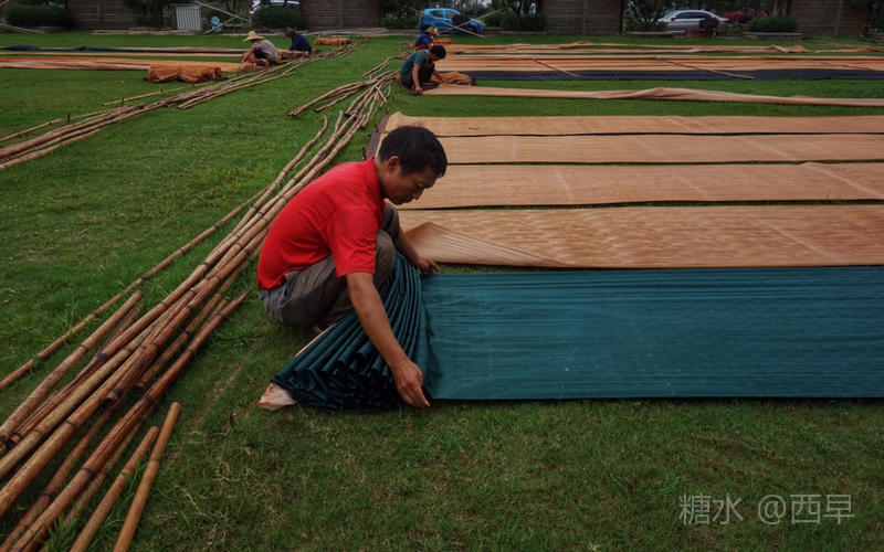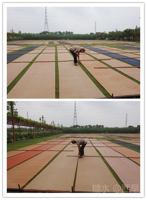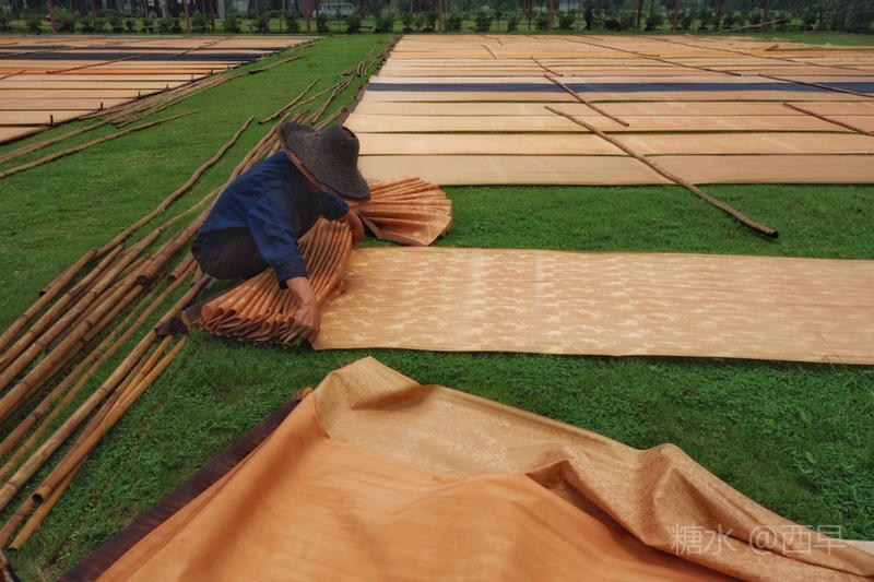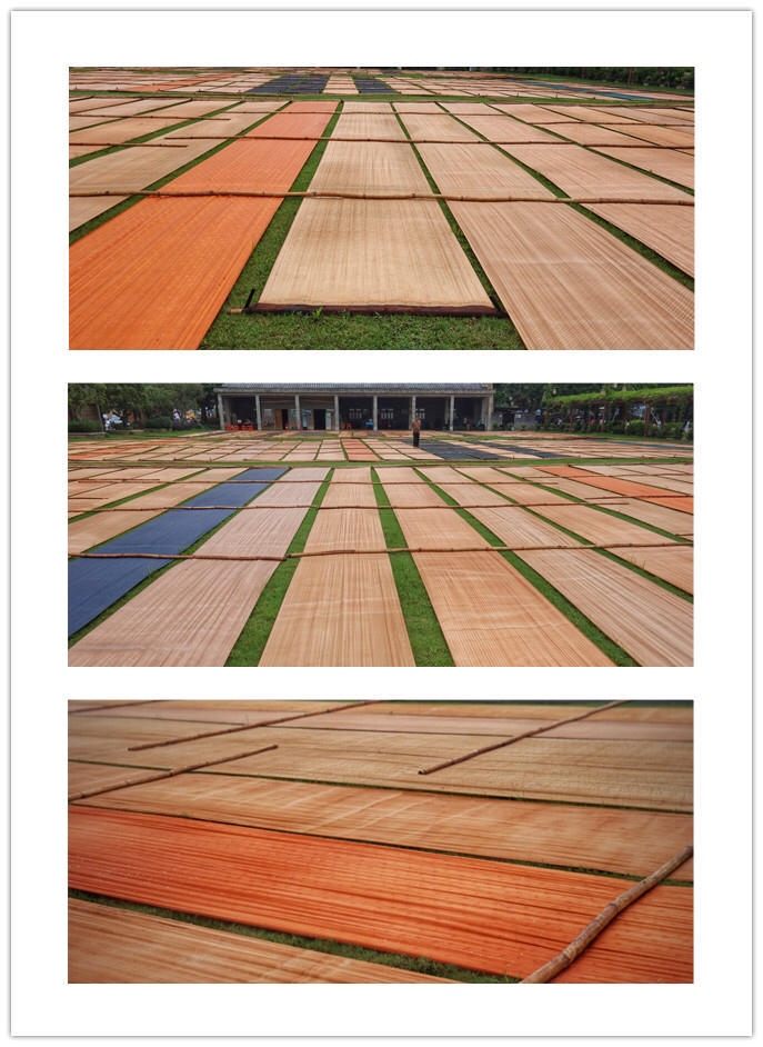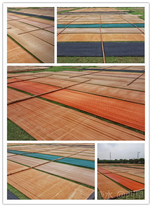一块块的莨纱整齐地平铺在草地上,用一根根的长竹竿压着,以防被风吹乱。