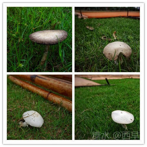 这个季节,晒场漂亮草地上也冒出了小小的野菇。影响晒莨的野菇都要被清理。这些是晒场边的遗留。