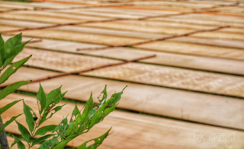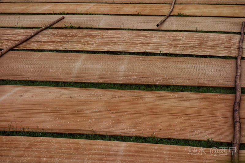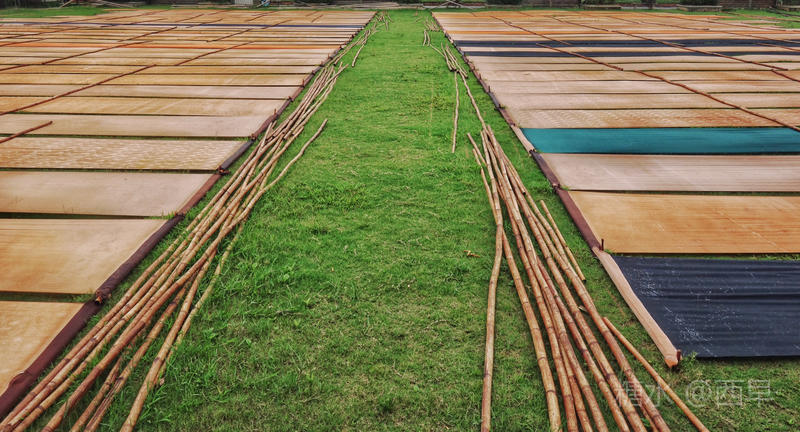 晒地的草身要求较硬,在草皮上晒莨时,即可使绸疋保持清洁,又因草类受天地雾露的滋润,使绸疋在高温曝晒下有一定湿度,便于充分吸收薯莨水,达到成品柔润亮泽的效果.