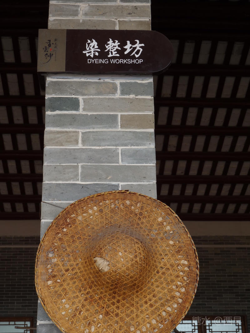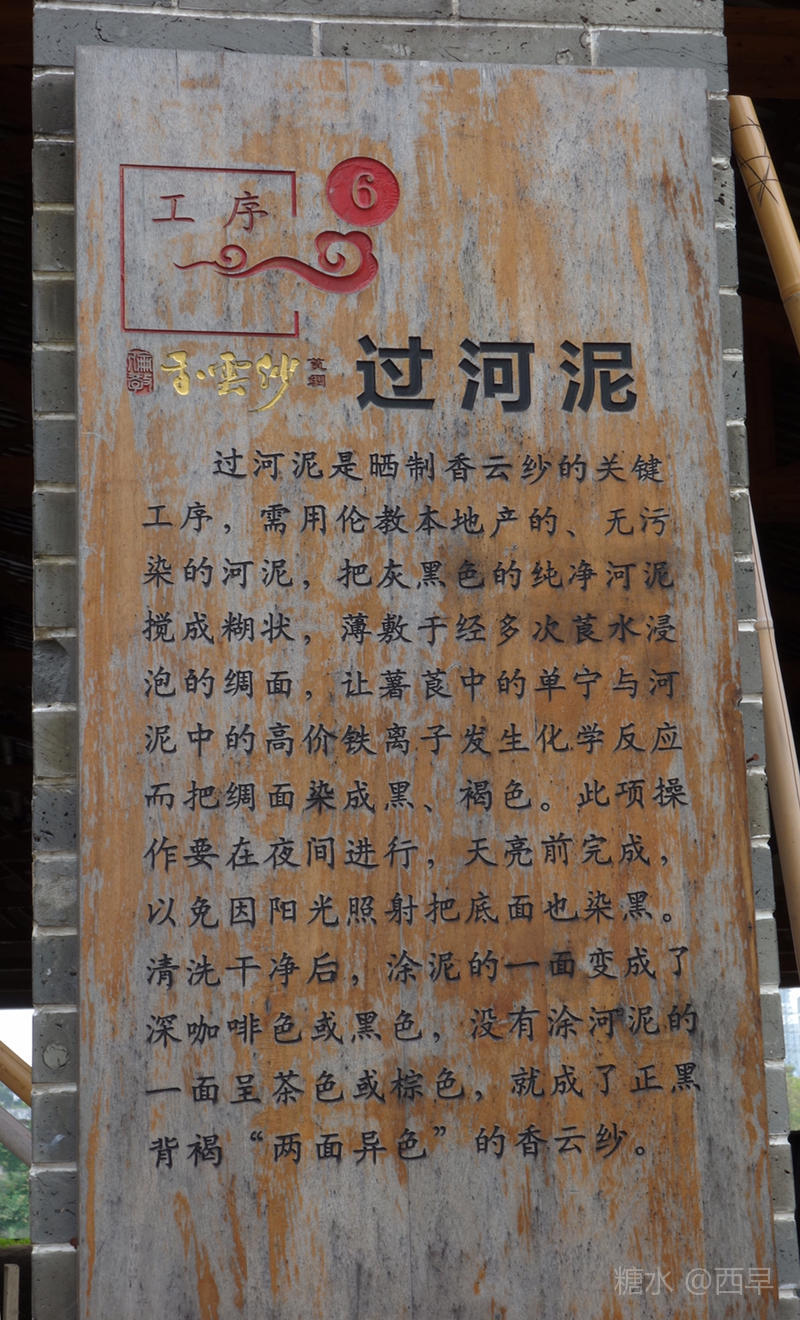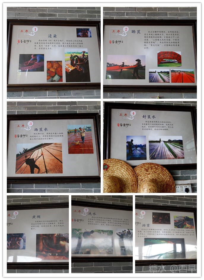染整坊里挂着香云纱的染整工序的镜框。供参观者了解香云纱的染整技艺。
