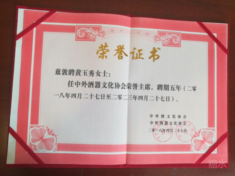 聘任黄玉秀女士为中外酒器文化协会荣誉主席。