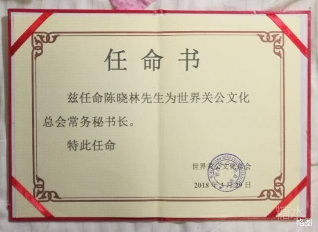欧美亚国际控股投资集团董事局主席、世界关公文化总会主席张儒先生【右】为陈晓林颁发聘任证书。