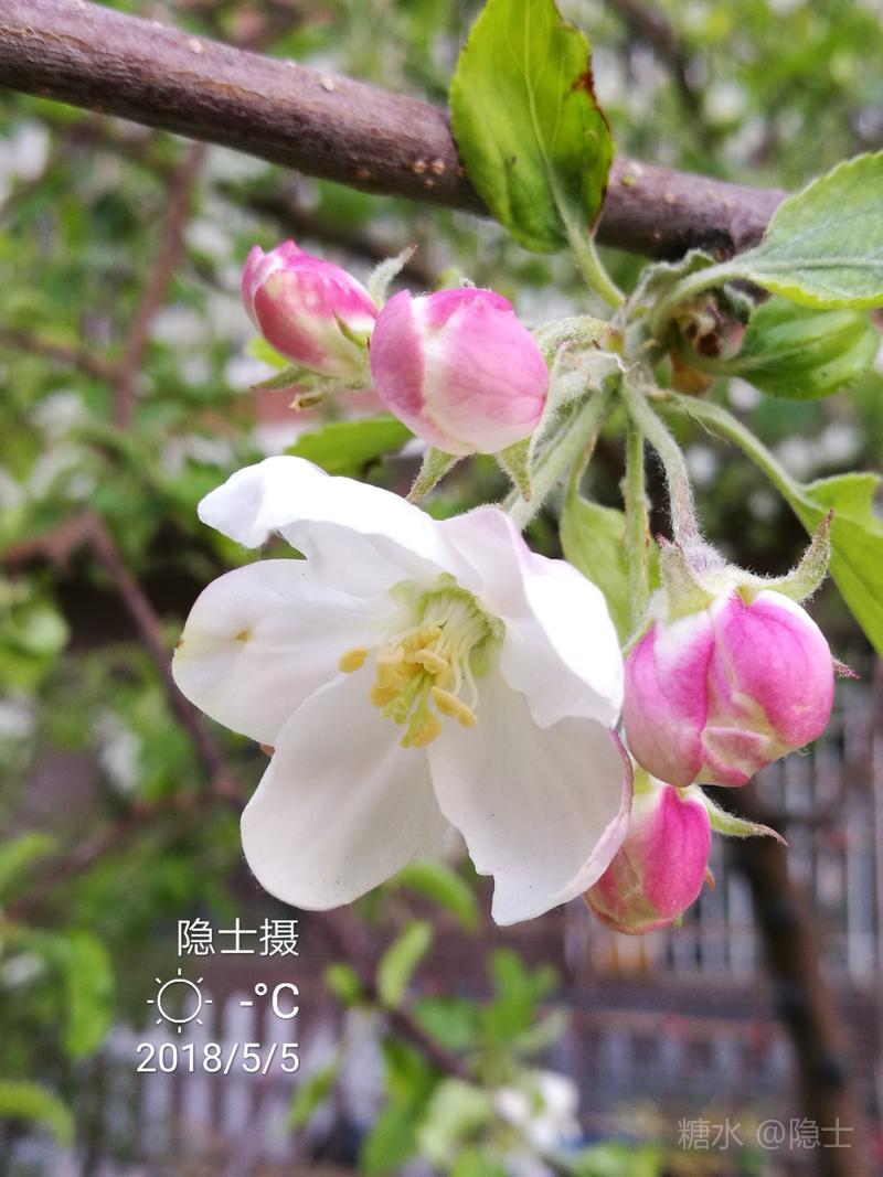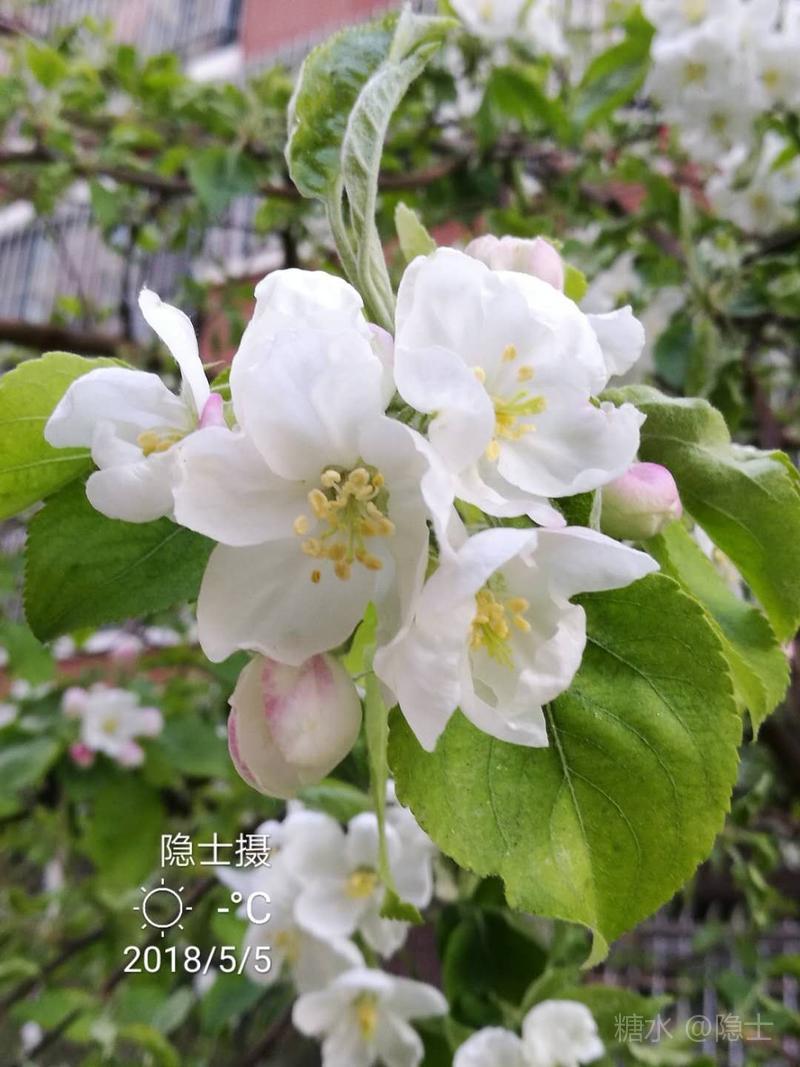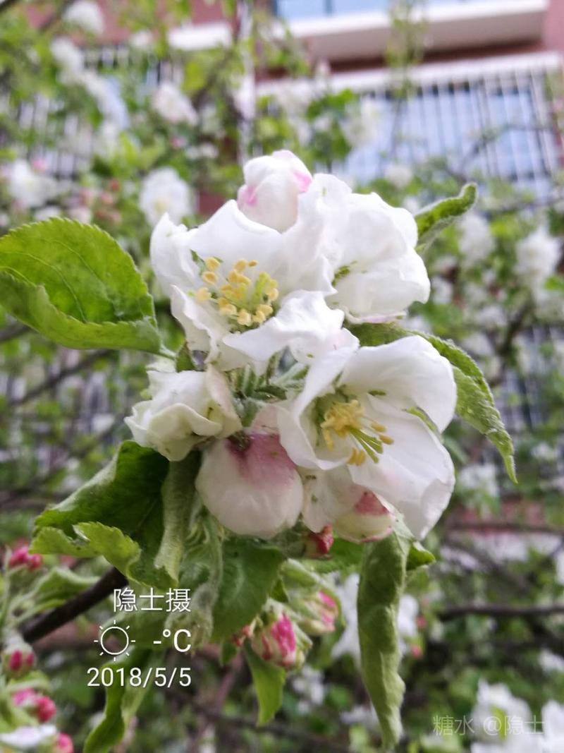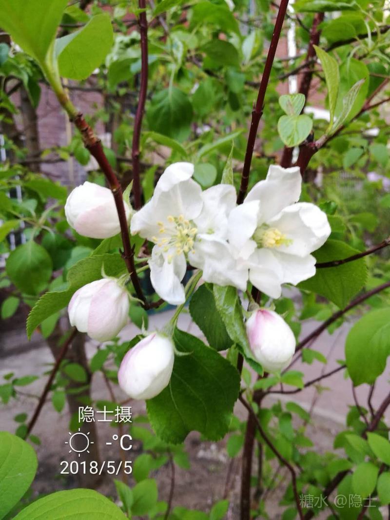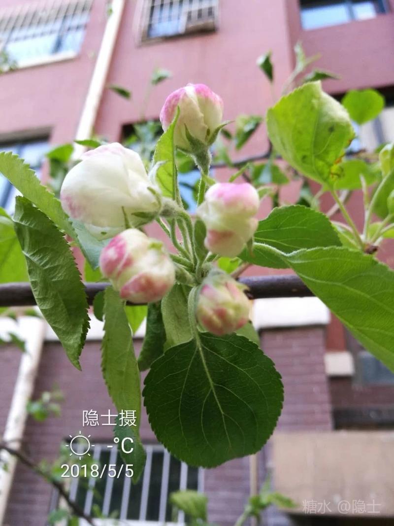 2018-5-5小区里的沙果树开花了!娇艳的白色、粉色的花朵花蕾在嫩绿的叶子陪护下,贪婪的享受着阳光;在春风的抚弄中,微笑着欣赏循香而至的蜜蜂在自己敞开的心房上来来往往的舞步…
