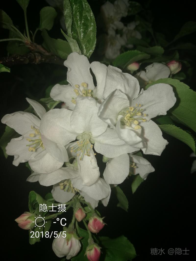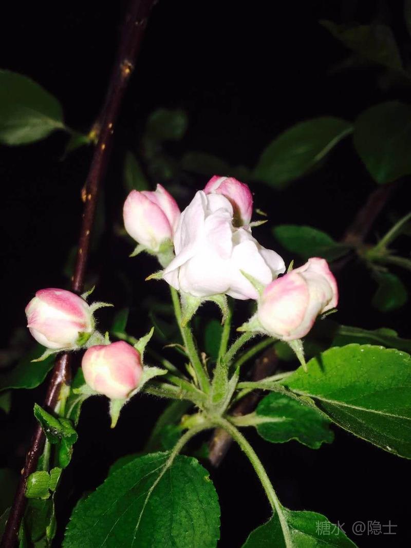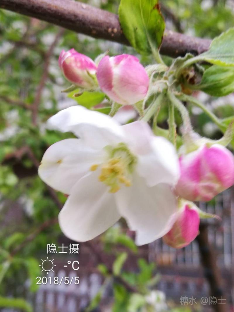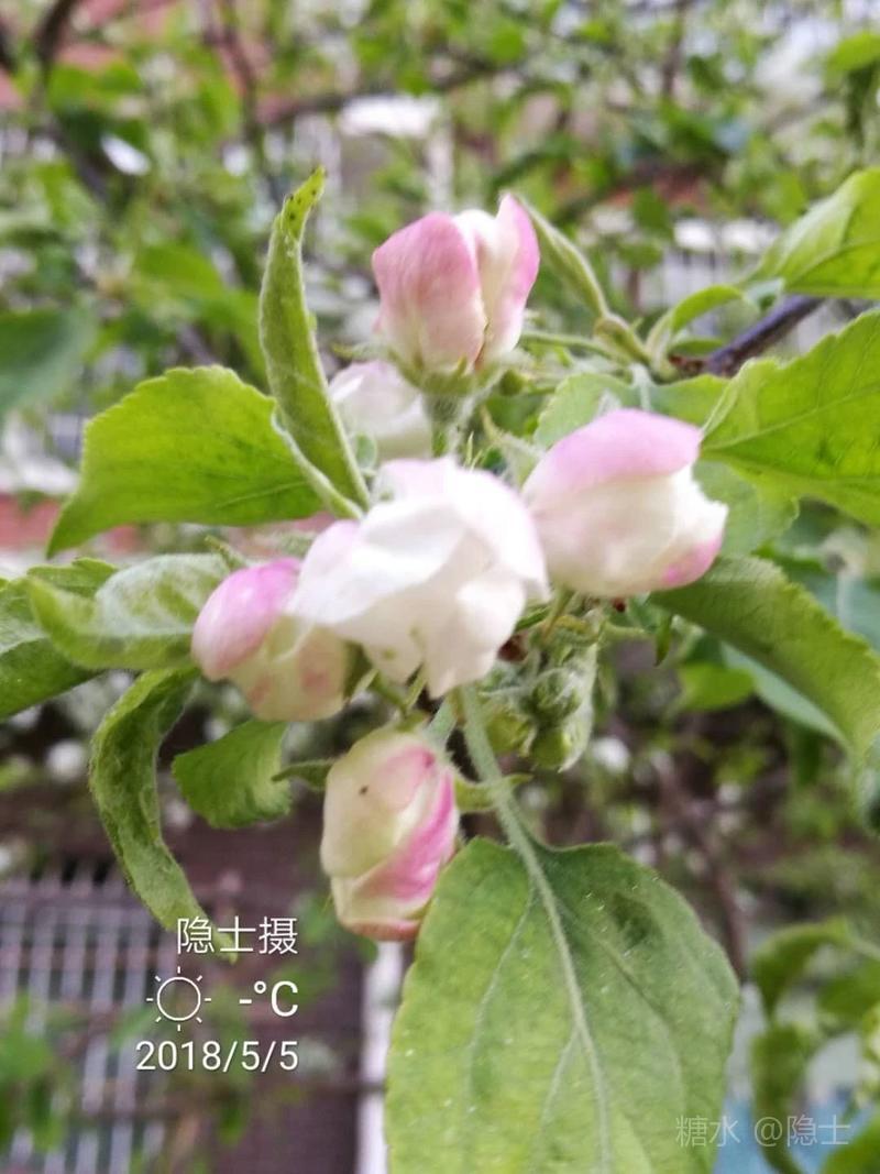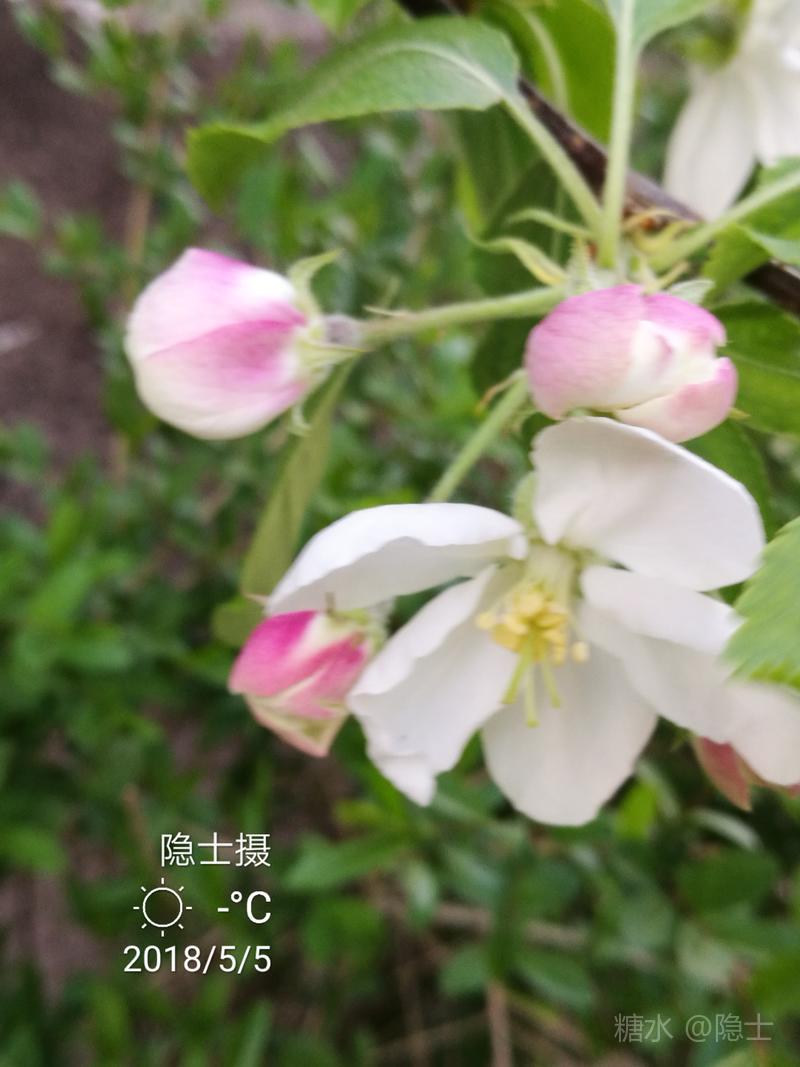 2018-5-5小区里的沙果树开花了!娇艳的白色、粉色的花朵花蕾在嫩绿的叶子陪护下,贪婪的享受着阳光;在春风的抚弄中,微笑着欣赏循香而至的蜜蜂在自己敞开的心房上来来往往的舞步…