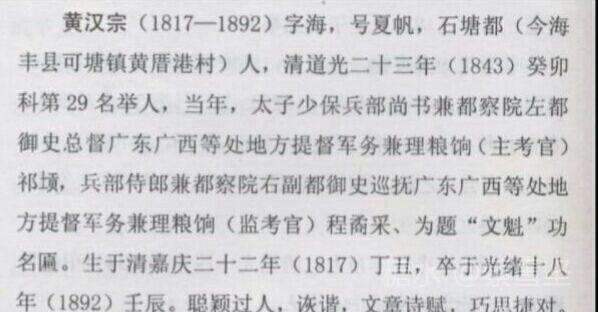 清嘉庆十九年(1814年),惠州府海丰县石塘都罗山约黄厝港村(今属可塘镇黄厝港村)的一个宁静的平原小村庄,黄氏家族中的一个小男婴呱呱坠地,故事就此展开了。这个男婴叫黄汉宗,小名黄海,字衍潜,号夏帆,汉宗其名取《诗经》句:“聿彼江汉,朝宗于海”之意。
