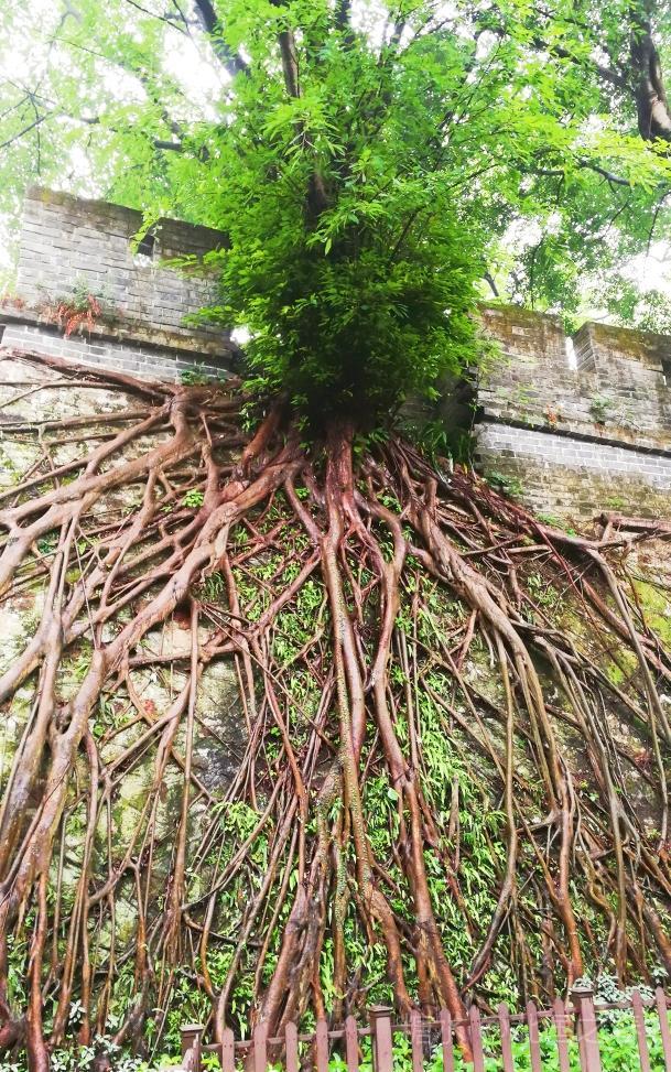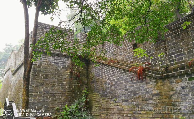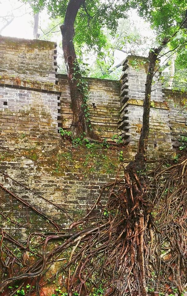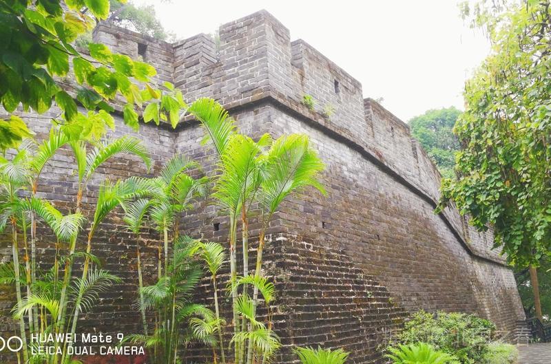 明代古城墙——广州古城墙,从中山纪念碑后边,折向西行,可见一段古城墙,逶迤伸展,隐没在丛林深处,共长约1100多米,断断续续,横跨越秀山。它是广州保存的唯一一段明代城墙,也是广州现存的最古老城墙,迄今已有600年的历史。