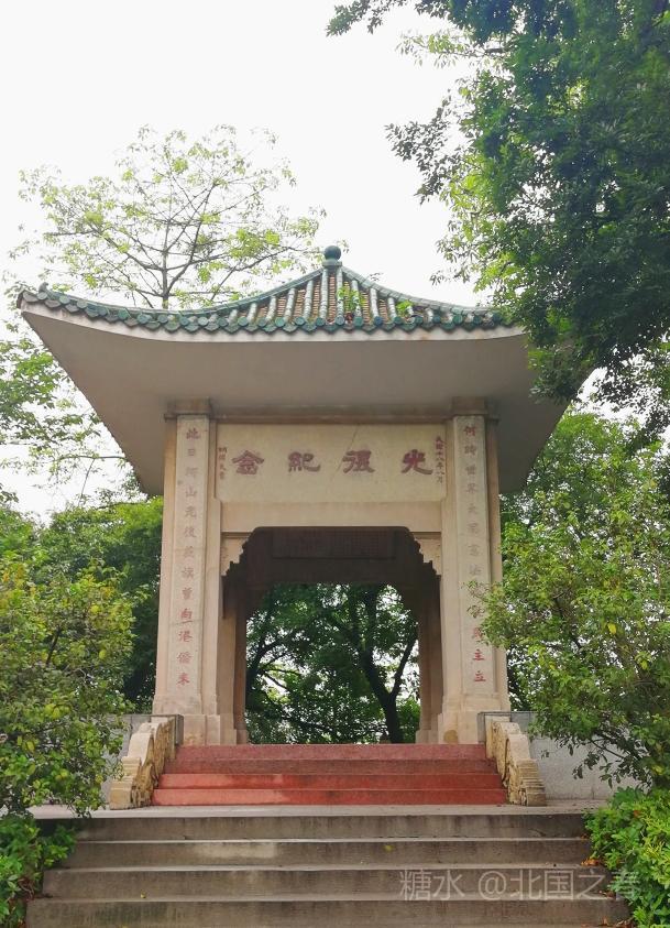 光复亭,1911年10月10日武昌起义爆发,11月9日广东宣布独立;推举胡汉民为广东军政府都督。此时“义军云集,清吏宵遁,库藏如洗,饷粮告匮”,军政府组成港侨筹饷局,筹得款项400余万元,乃于1929年在越秀山建光复牌坊嘉勉纪念。