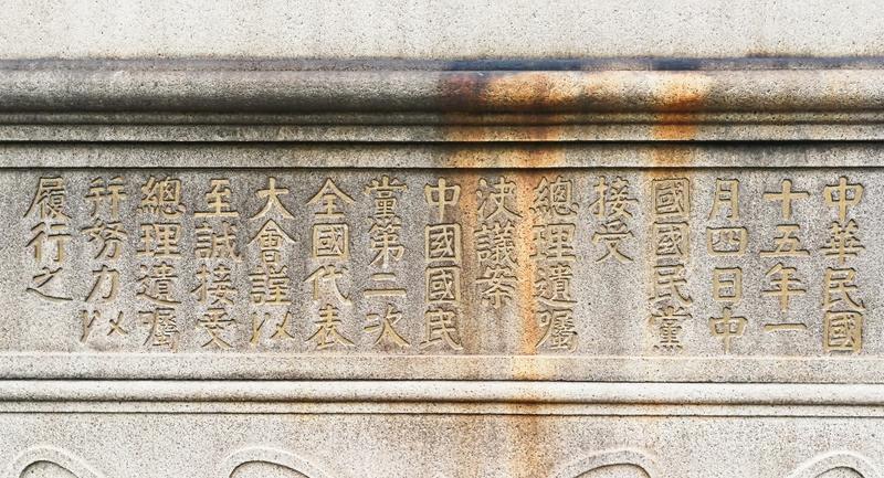 碑基上层四面有26个羊头石雕,象征羊城。石碑的正面是长约7米、宽约4米的巨型花岗石,上面刻着孙中山的遗嘱。碑体所在平台,有铁栏杆,周围树木郁郁葱葱。孙中山纪念碑与中山纪念堂同处于广州城传统城市中轴线上,连成一体,成为广州近代城市的标志。现为国家级重点文明保护单位。
