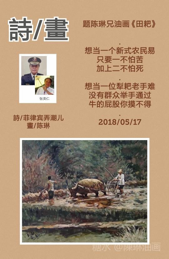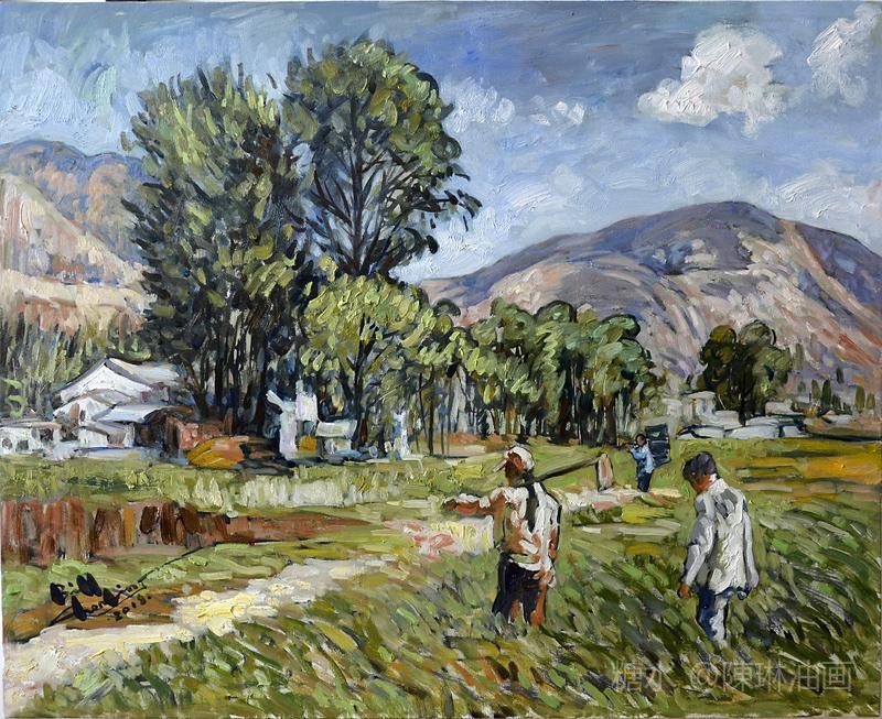 布面油画《田耙》 高坡顶上栽泡桐 泡桐树上掛灯笼 风吹灯笼团团转 火烧灯笼满天红 蘇麻草儿尖对尖 今年洪水要朝天 洪水朝天我不怕 变个雀雀飞上天