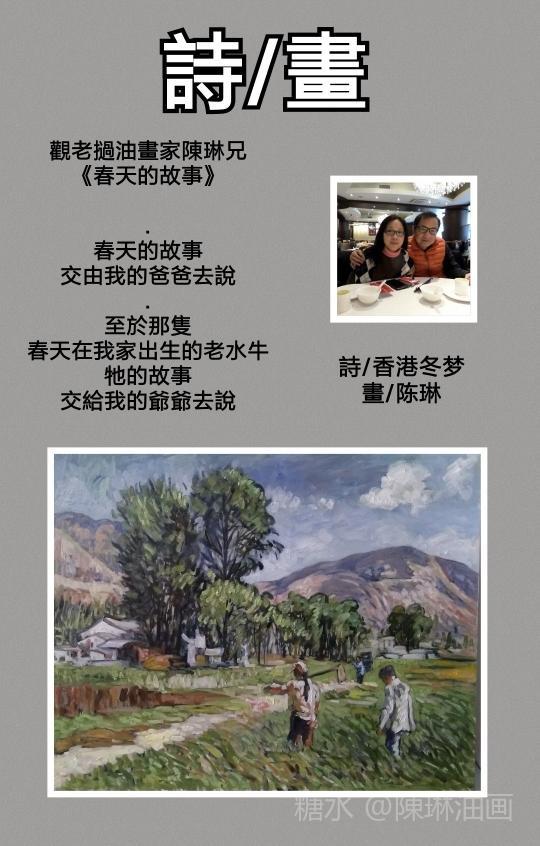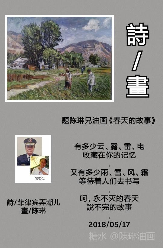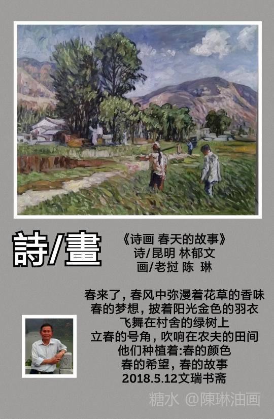 《春天的故事》 文/昆明林郁文 沉睡了一冬的村子 在弥漫着清香的草尖上 睁开眼睛,村前火红的红花绿树 点燃了春的脚步 荷锄的农夫 种出了这副 春的颜色春的故事和春的祝福 2018.5.12 昆明文瑞书斋