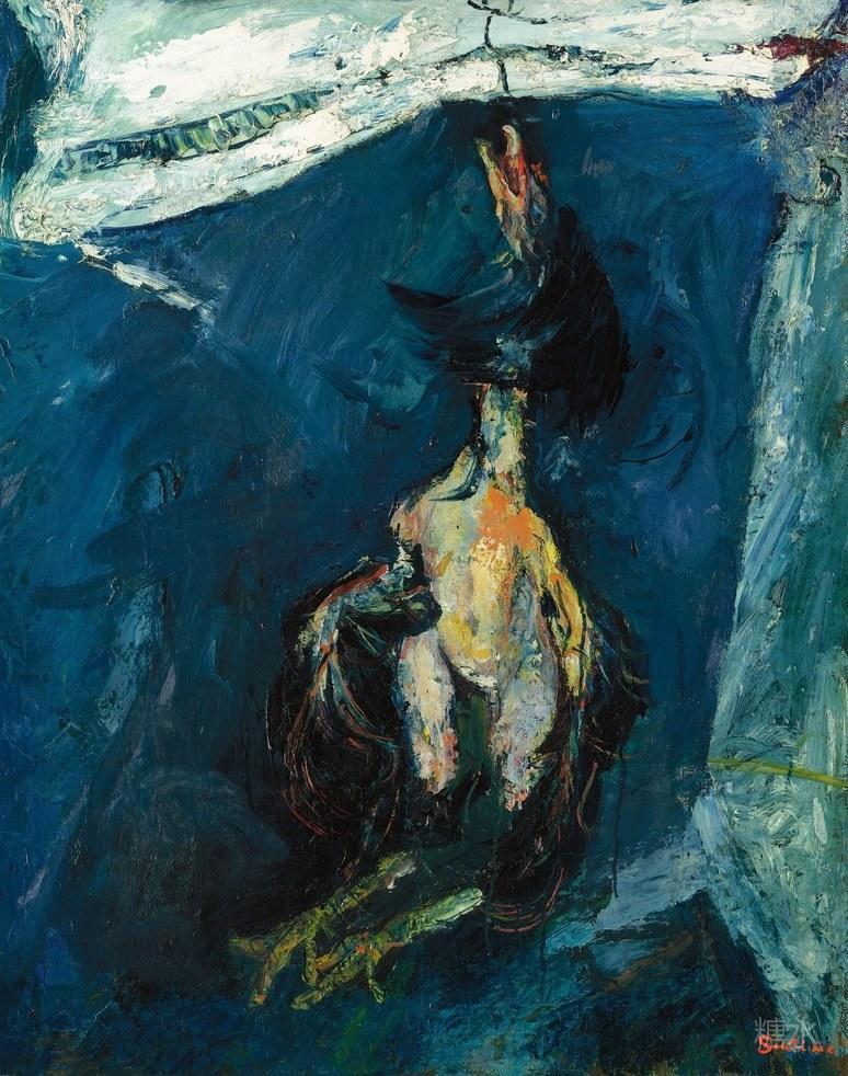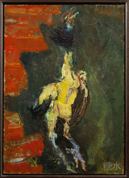 柴姆·苏丁,《悬挂在砖墙前的鸡》,c. 1925 鸡鸭鱼肉都在苏丁的作品中有着很好的体现。 《悬挂的火鸡》(Hanging Turkey, c. 1925,两幅)、 《桌上的两只山鸡》 (Two Pheasants on a Table, c.1926)、 《蓝色背景中的火鸡》 (Chicken on a Blue Ground, c. 1925)和《悬挂在砖墙前的鸡》(Chicken Hanging Before a Brick Wall, c. 1925)都表现了等待被处理、进而端上餐桌的鸡的尸体。第一幅《悬挂的火鸡》表现了被拔掉躯干羽毛的火鸡,我们只能从头部和翅膀仅剩的羽毛推测它生前的风采。大概生前是一只骄傲的鸡,于是在这不公的命运来临时,表情有些不甘。艺术家似乎很喜欢用蓝色做背景。这忧郁的颜色是否是在向这些动物默哀,或者表示同情?