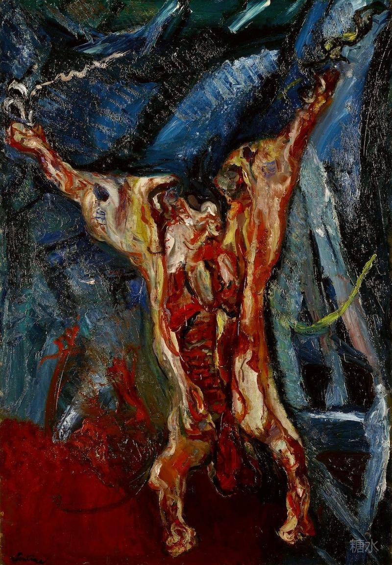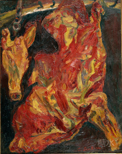 柴姆·苏丁,《牛肉》,c.1925 苏丁画中的牛肉都是从市场买来的鲜肉。但是由于作画速度太慢,作品还未完成时,牛肉就开始腐烂。为了在视觉上呈现出新鲜的效果,他不断地将血泼到尸体上。牛肉散发出糟糕的气味,苍蝇也在工作室内飞来飞去。邻居们对此抱怨不已,他们向巴黎的卫生部门人员进行了举报。卫生人员来到他的画室,而他早就躲了起来。