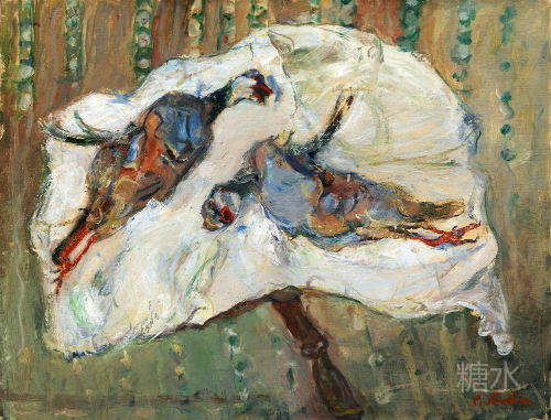 伦勃朗,《被宰杀的牛》,1655 这幅画让人想起藏于法国卢浮宫的伦勃朗的名作——《被宰杀的牛》(The Slaughtered Ox)。当然,这不是巧合,苏丁曾多次到卢浮宫学习大师的作品,伦勃朗也曾给过他重要的启发。