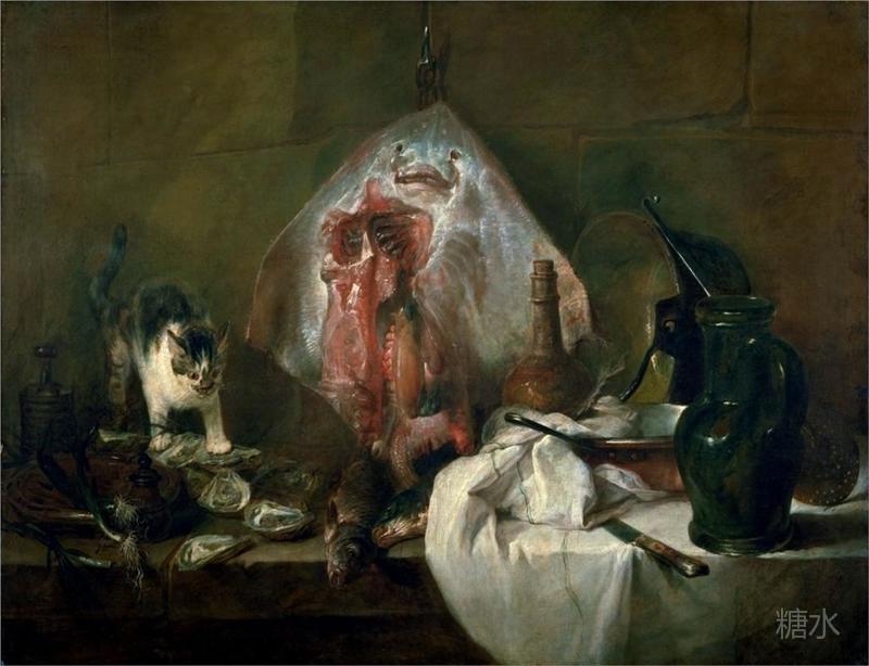 夏尔丹,《鳐鱼》,1728 我们可以从《有鳐鱼的静物》(Still Life with Rayfish,c.1924)这幅作品中,明显地看到夏尔丹的影响。同样擅画静物的法国画家夏尔丹,在1728年画下作品《鳐鱼》(The Rayfish)。除鳐鱼外,画面中还有静物和其他海鲜,一只小猫表情贪婪地享受着这场饕餮盛宴。在两幅作品的对比中,我们可以明显感受到苏丁对被描绘物进行的现代主义改造:鳐鱼的形象用更加直观流畅的笔触表现出来,颜色仿佛在画布表面流动;水果和罐子不再严格符合现实,形体在弯曲中似乎增加了更多的张力,这部分归功于苏丁对边缘线的强调。