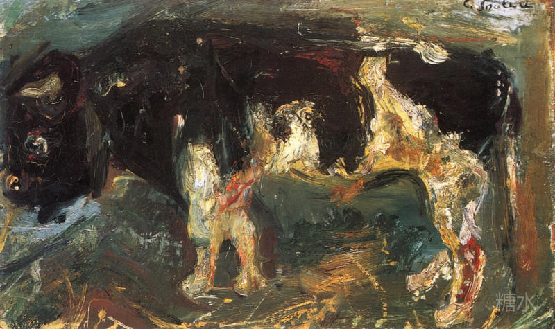 柴姆·苏丁,《公牛》,1942 展览的最后是苏丁晚年创作的一些画幅较小的作品。 《小驴子》 (Small Donkey, c.1934)、 《围栏后的羊》(Sheep Behind a Fence, c.1940)、 《公牛》(The Bull, 1942)都来自私人收藏。在创作这些作品时,因为纳粹对巴黎进行了入侵,苏丁不得不躲藏到郊外。在这里,他的宿疾——胃溃疡得不到有效的医治,以至于最后威胁到他的生命。因为痛苦,他的脾气变得更加暴躁了。他不再描绘动物残骸,而是转向描绘附近农场中的动物。