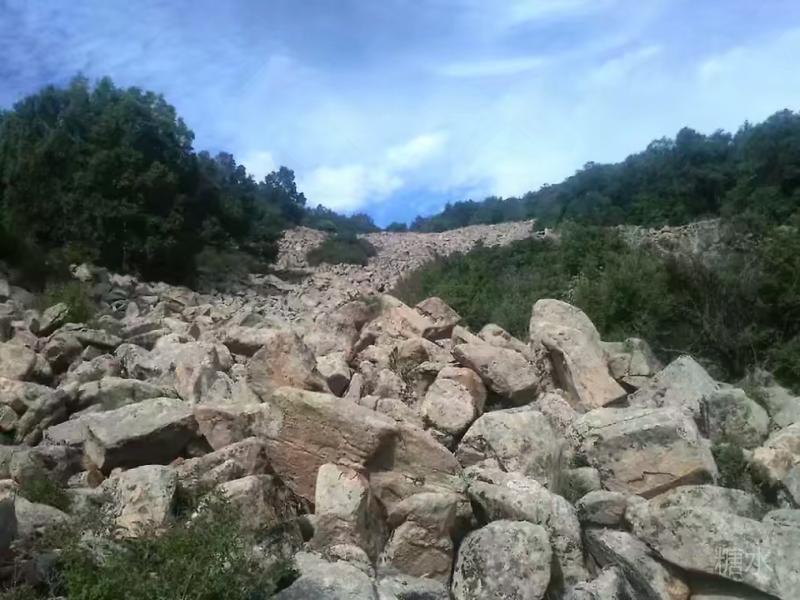 在大坝沟大量分布着由许多不规则大石块堆叠而成的庞大的乱石带,当地老百姓称之为“烂石窖”或“乱石窖”。这是第四纪冰川遗迹,距今约二三百万年,因受寒冷气候影响,山体侵蚀较大,山脉岩体表层的冻融作用很强烈,尤其在岩石节里、裂隙发育处极易劈裂风化作用,导致岩体不断崩塌或滚落形成大量矿石堆积,堆积在一起的石块,成片分布在平坦山顶或缓坡之上便形成了石河。在现在的部分地区还可以见到石河形成时期的“流水沟”,石河、石海的形成与冰川的存在有关,但属于冰缘区地貌。后来冰川不断沿河漂移,携带大量石块聚集在沟谷低凹处形成“石蛋地貌”。与石海、石流坡之间彼此存在着有机联系,往往在同一山地同时出现,常常是山上巨石铺地,山坡中石遍布,山麓碎石成流。