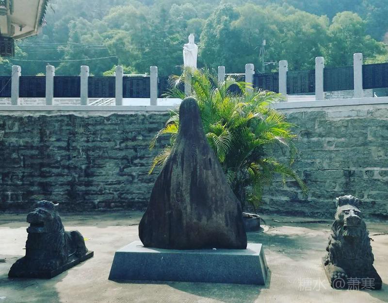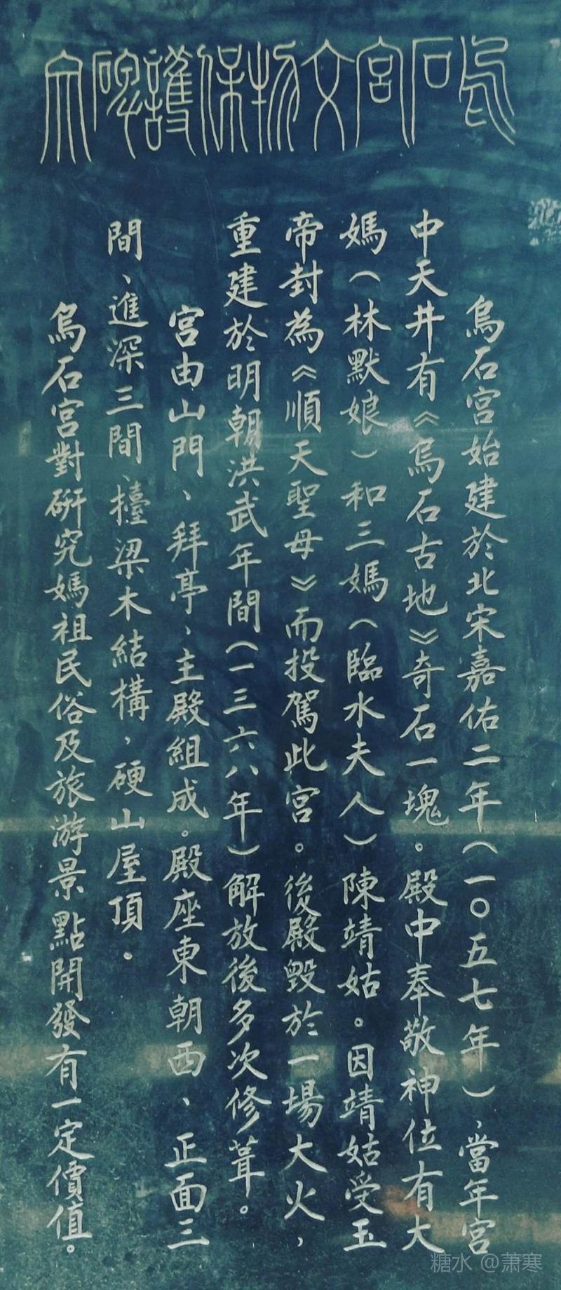 却说陈靖姑自洛阳江回临水途中,忽见一处乌云密布,滚滚浓烟直冲云霄,遂按下云头,定睛一看,原来是一头金毛青狮口吐浓烟阻住云路,青狮脚下一块上圆下方略呈椭圆形的黑色石板金光闪闪;又见四周群山环抱,鸟语花香,宛然一处绝妙的蓬莱仙境。陈靖始正在惊诧之间,观音菩萨从天庭冉冉而来,说:“靖姑,玉皇大帝已封你为顺天圣母,你当庇护一境庶民平安。文殊菩萨已领如采法旨,令座下坐骑金毛青狮为你寻得此方宝地,你应在此开基建殿,救苦救难。”观音菩萨说罢,随口念曰:“青狮扶乌石,白鹤朝圣母,三狮相追逐,龟蛇堵水口。”尔后右手一伸,但见青狮脚下的那块乌石金光闪闪飞至观音手中。乌石正面书有“乌石古地”四个金字,背面是书写如来法旨的梵文,预示着乌石宫以后的兴旺发展。观音恐泄霹天机,掌心一抹,将这段梵文抹去,但字迹依稀可辨。
