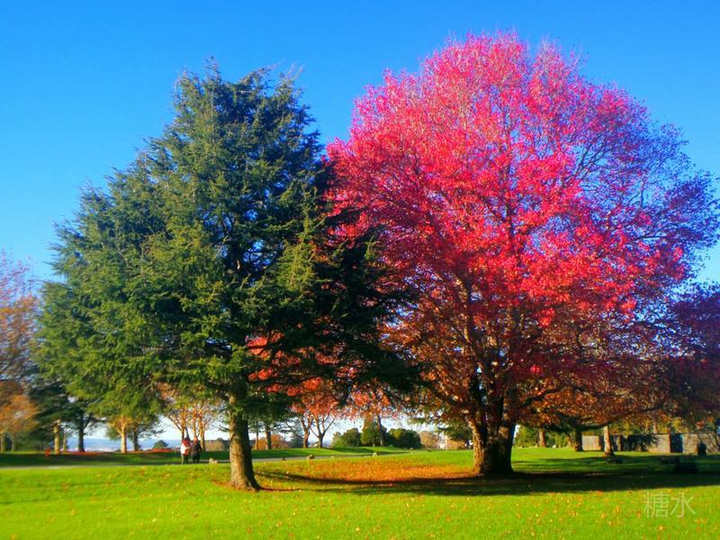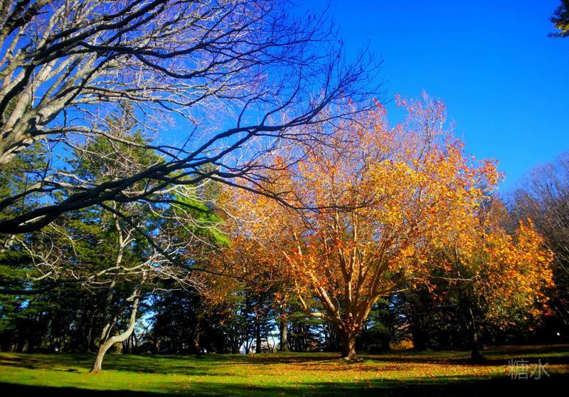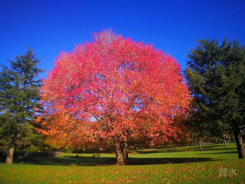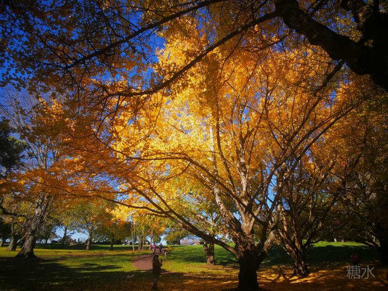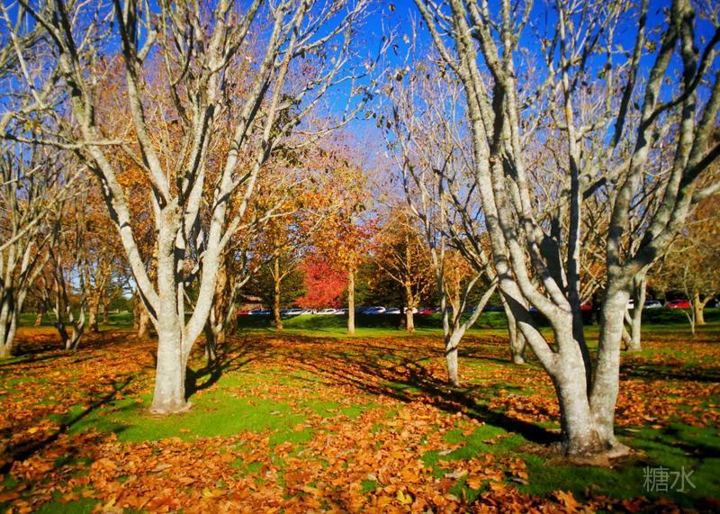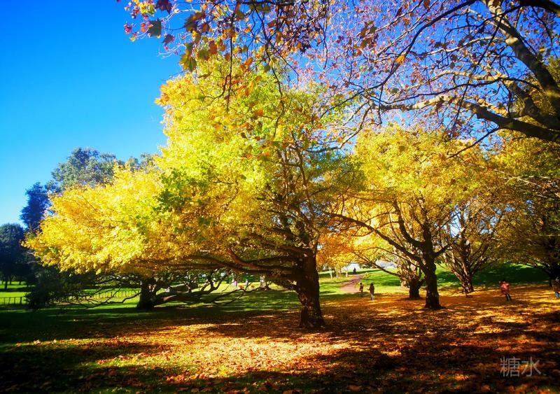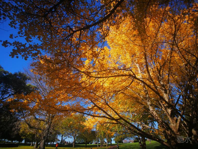6月是奥克兰的初冬,早晚温差大,日落后和日出前寒气逼人,一夜之间露水润湿了草木。而在康沃尔公园(Cornwall Park)到处都是红黄绿树,把在公园染得红肥绿瘦、黄艳红淡,把路人醉死了。