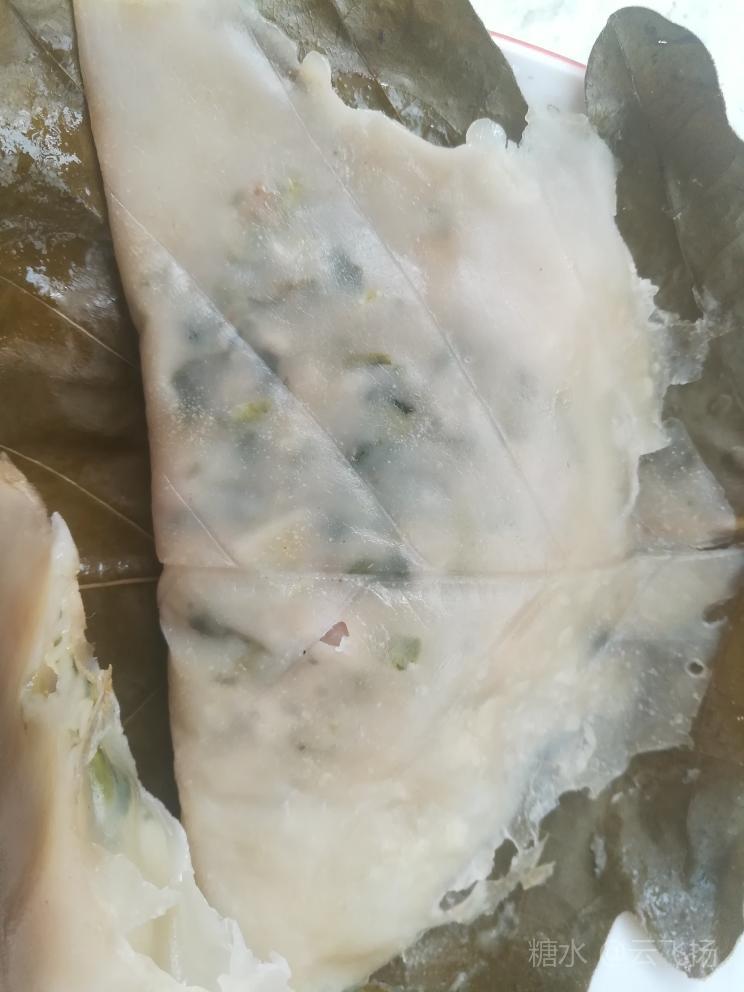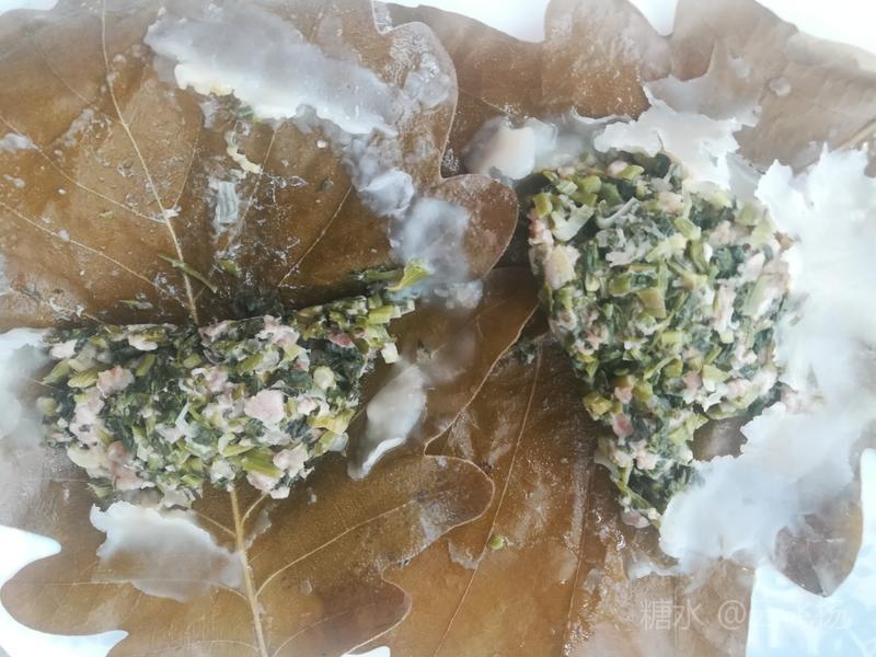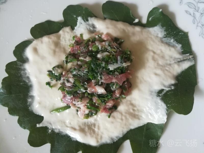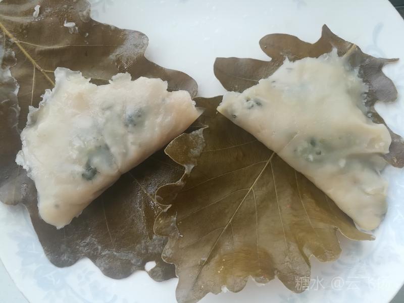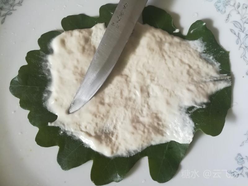 做到最后,面糊用完了,就把馅儿直接放到桲椤叶上了,用残余的面糊粘上,这算不算创新呢。