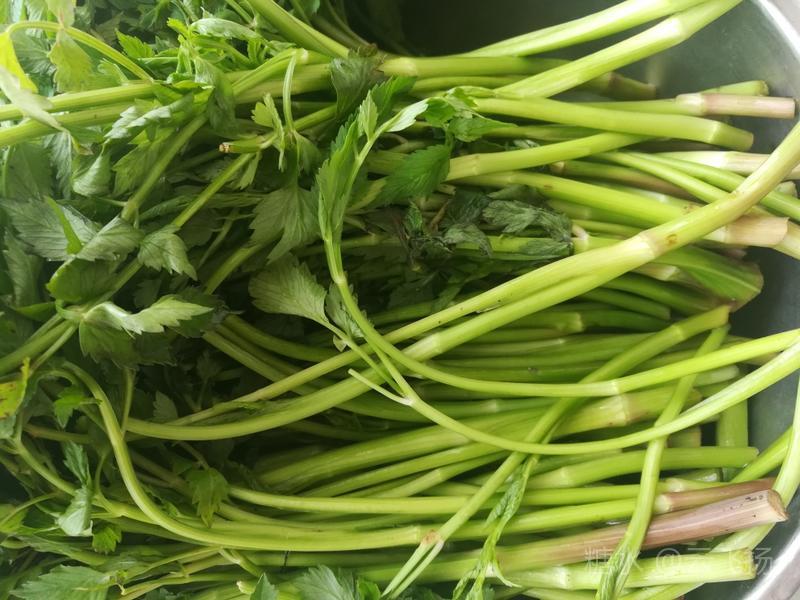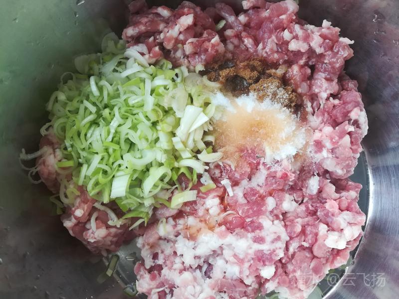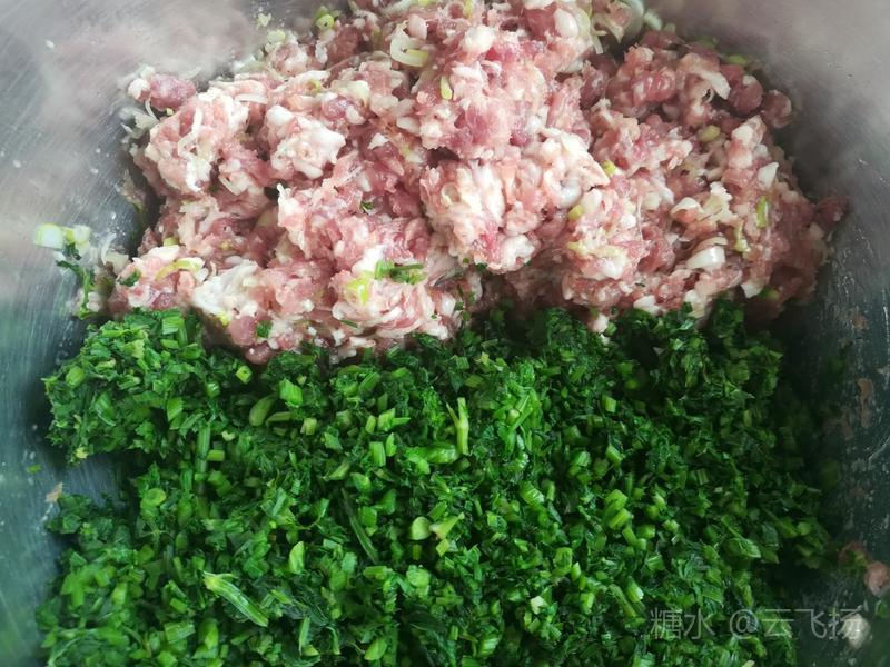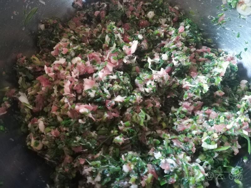 2、再喂拌馅料:猪肉成馅,加入各种调料和菜馅,我用的菜馅是野菜“大叶芹”,是焯过水的,其它的蔬菜也可以。