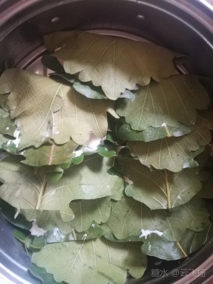 3、整理叶子:桲椤叶去叶柄,洗净,用开水烫一下。我试验了一下,烫过的桲椤叶,更绿更柔软更易操作。