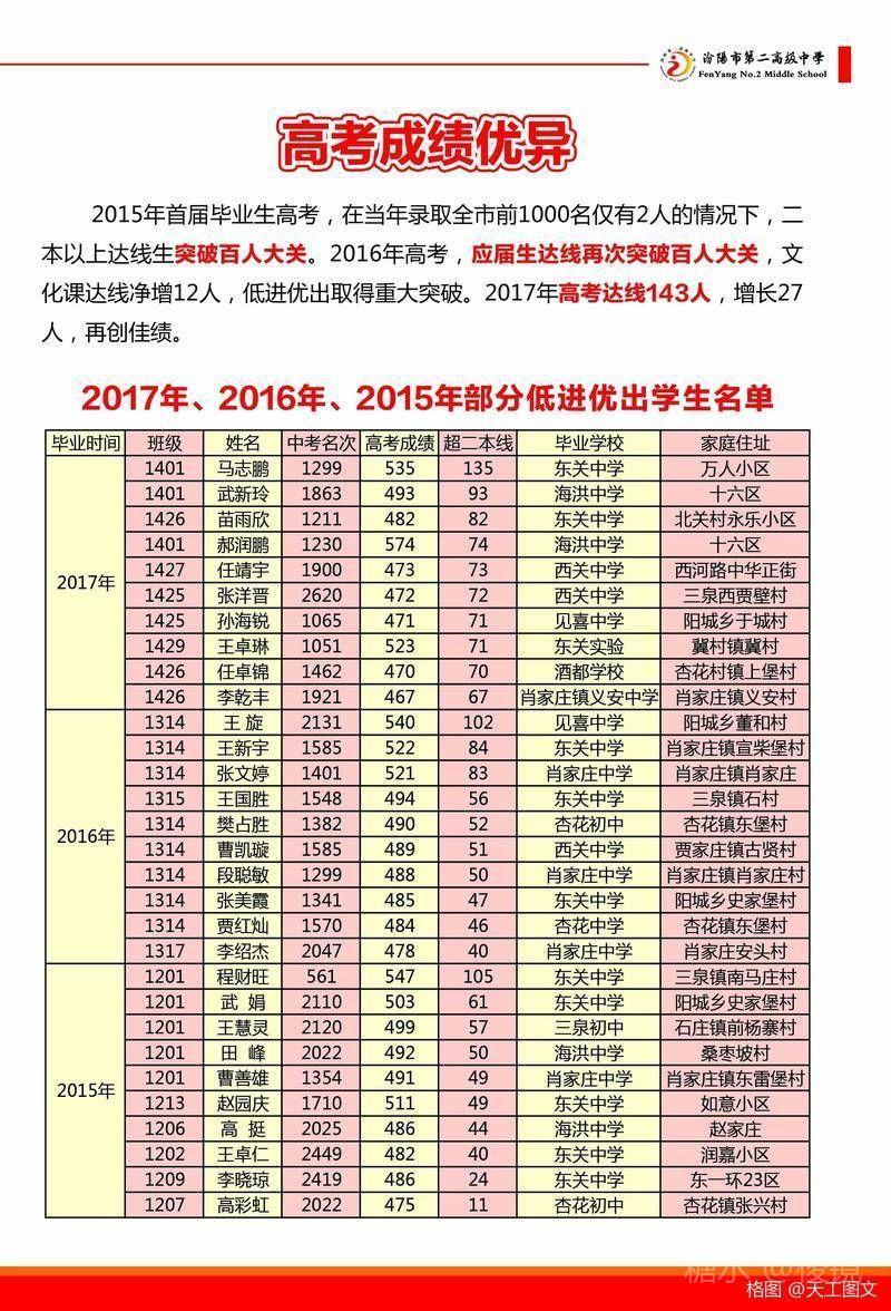 ⭐️ 一、高考成绩优异。在当年录取全市前1000名仅有2人的情况下,2015年首届毕业生高考,二本以上达线生突破百人大关。2016年高考,应届生达线再次突破百人大关,文化课达线净増12人,低进优出取得重大突破。2017年高考达线143人,增长27人,再创佳绩。