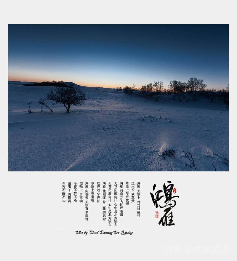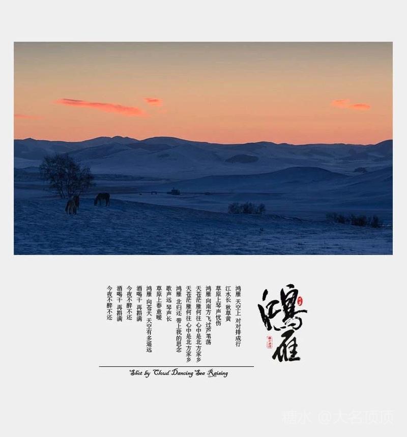 时髦老太太雅评: 很爱听《鸿雁》这首蒙族经典歌曲,但每次听着总有一种酸酸的感觉,有点催人泪下似的。今欣赏到大名顶顶老师的音画美格才知晓《鸿雁》的曲调采用了三世活佛罗布生丹毕佳拉森的原调。这里体现了兄妹二人挂念书信沟通,鸿雁传书之感,及思念家乡思念亲人的情感。这音乐歌声十分动情,非常感人,令人回味无穷。大名顶顶老师总是送来令人意想不到的精彩音画美格。这美格像一段很有趣味动听的故事。感谢大名顶顶老师精心制做。欣赏!喜欢!美赞!遥握!