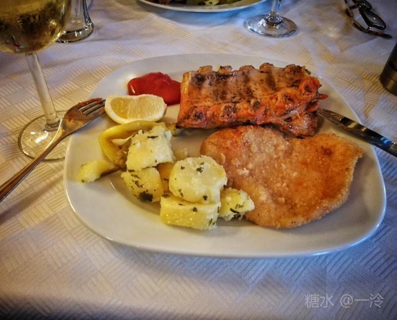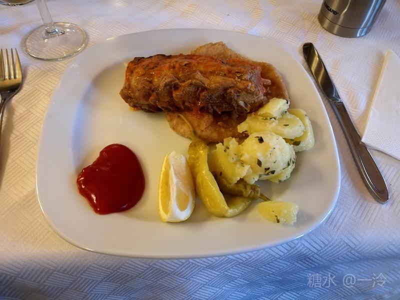 晚餐品尝号称奥地利国菜的炸猪排烤肋排,炸猪排感觉与上海的毫无差异,似乎应该蘸点泰康黄牌辣酱油。烤肋排汁水丰盈肉香袭人,于是刀叉齐上大快朵颐。值得一提的是那根黄色泡椒,毫无辣味酸度适中,与柠檬汁番茄酱共同佐餐恰到好处。
