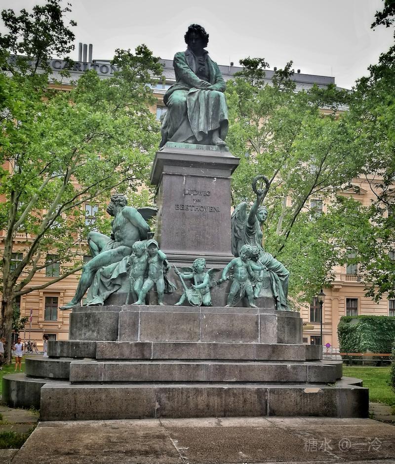 贝多芬是著名德国作曲家、钢琴家、指挥家,维也纳古典乐派代表人物之一,被尊称为乐圣。贝多芬青铜像矗立于维也纳艺术学院广场,贝多芬身披长袍,表情严肃凝重。大理石碑座上有男女两尊神像,下边还有9个小天使,代表了贝多芬九部不朽的交响曲。