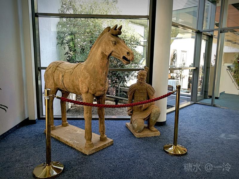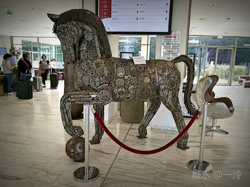 旅馆大堂中的兵马俑质朴无华,而用齿轮链条构成的洋马儿则透着现代韵味。