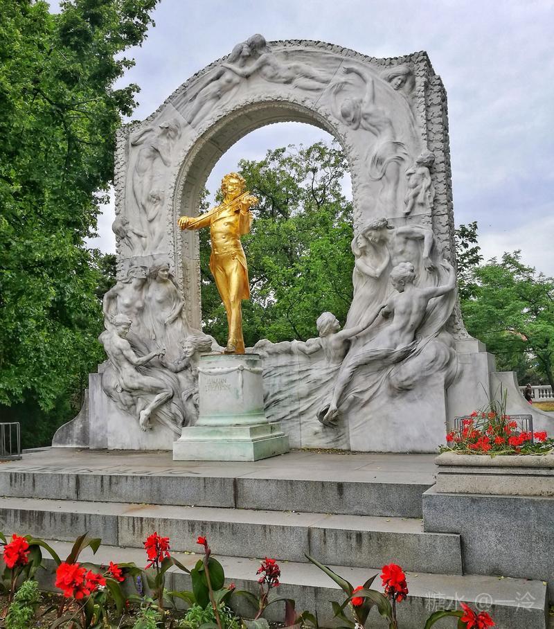 维也纳城市公园如同雕像展览场,其中最广为人知的就是小约翰·施特劳斯镀金雕像。小约翰·施特劳斯是奥地利作曲家、指挥家、小提琴家,创作了不朽名作《蓝色多瑙河》圆舞曲。他把华尔兹这种原本属于农民的舞曲形式,提升为哈布斯堡宫廷中的高尚娱乐形式,因此被称为圆舞曲之王。