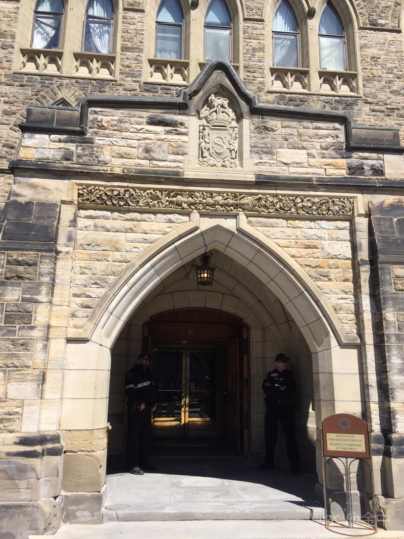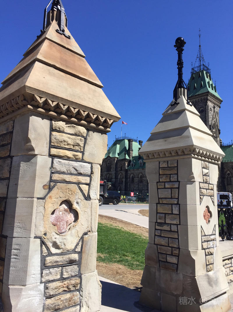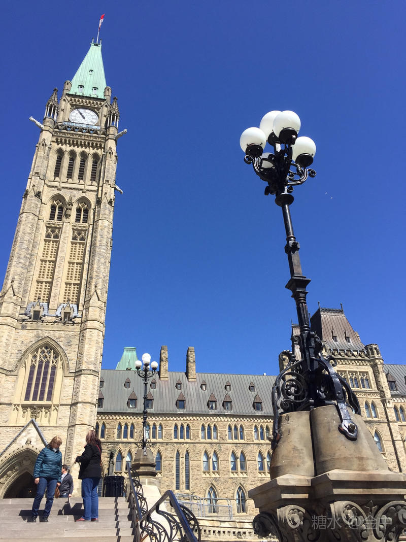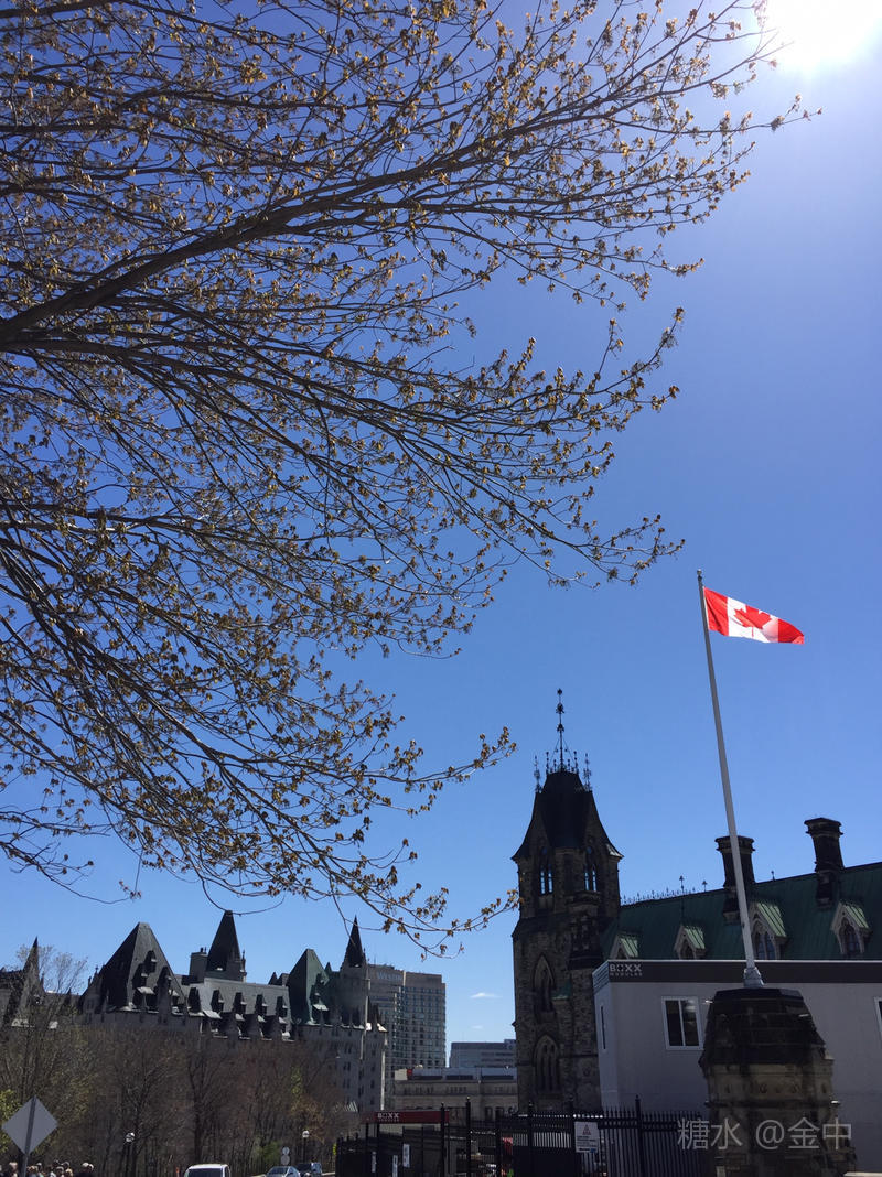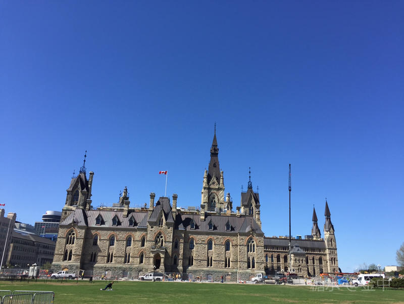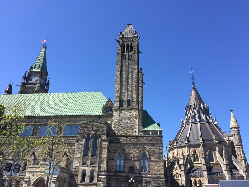 主楼是议会大厦,参众两院和总理在此办公,两栋偏楼是加拿大政府机关的办公楼。枫树叶国旗在钟楼上随风飘扬,和庄严雄伟的建筑一起展现了加拿大的民族精神。