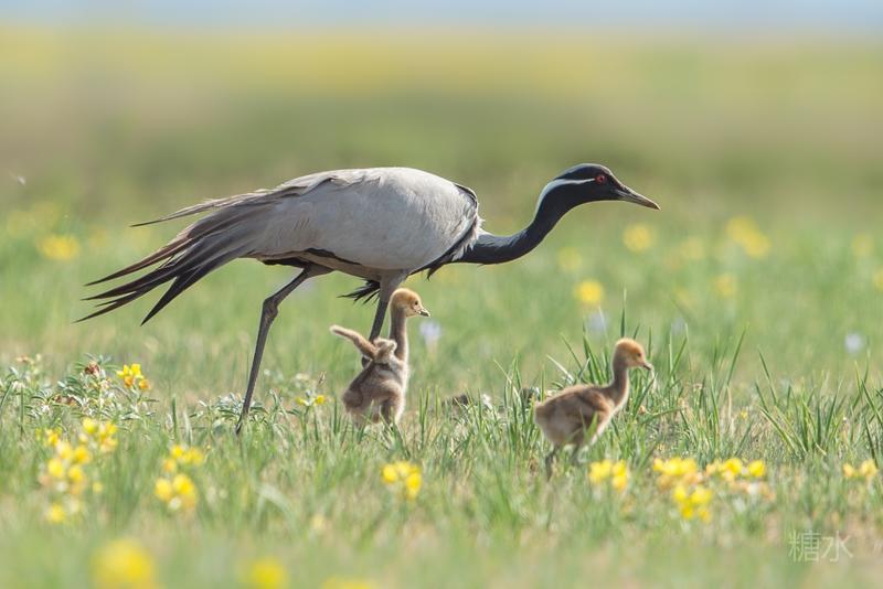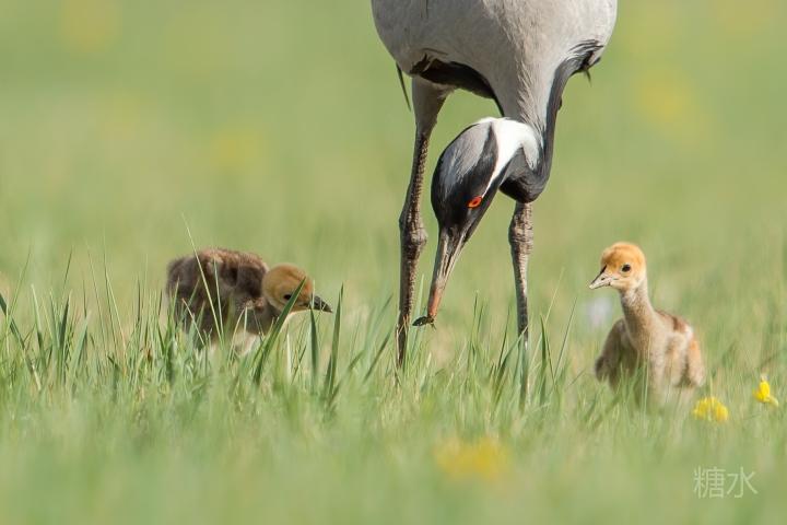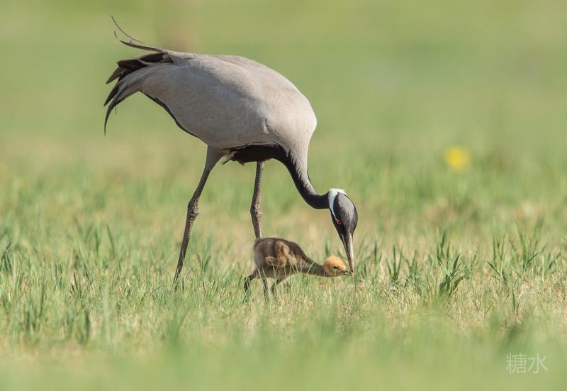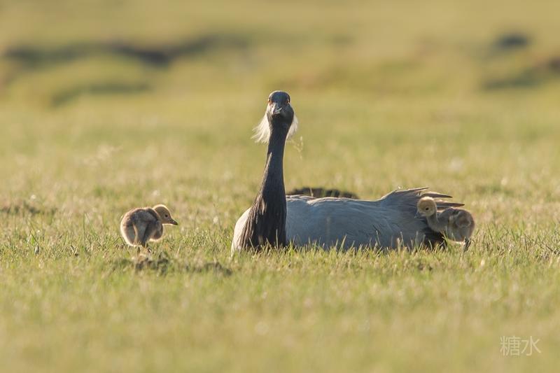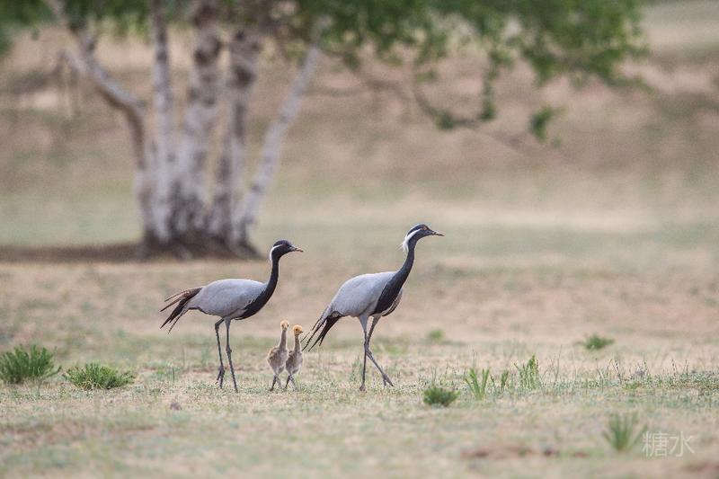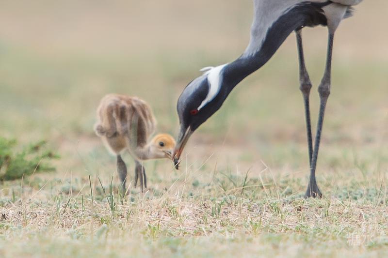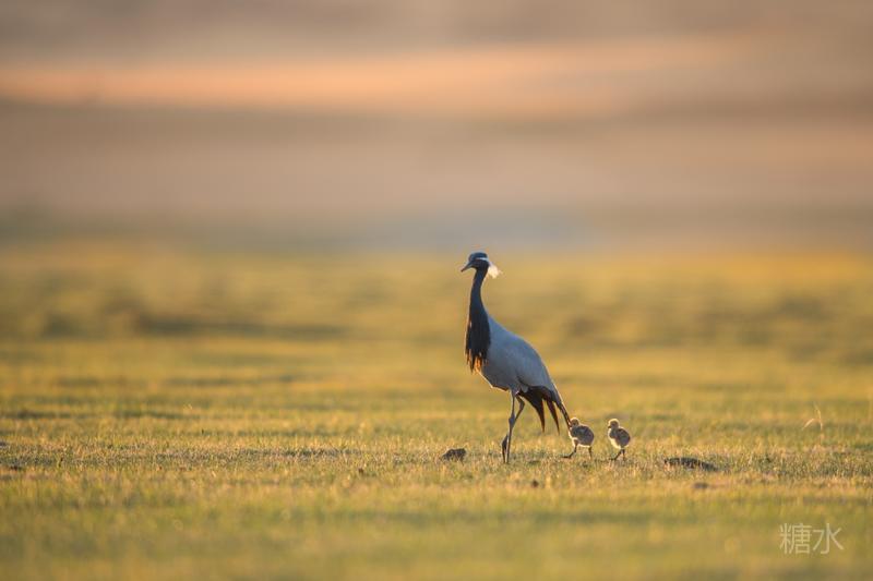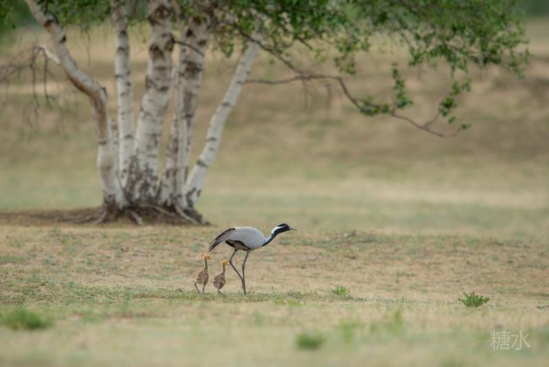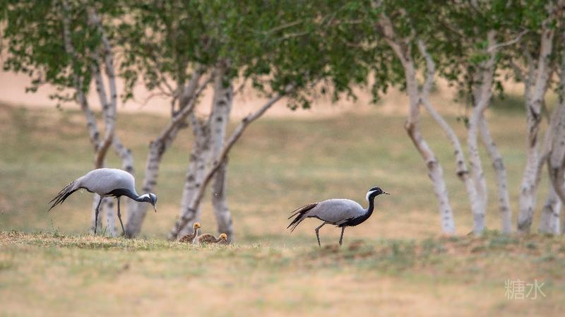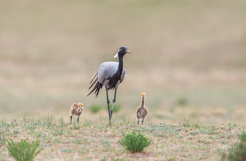 六月中旬蓑羽鹤幼鸟出壳,在父母的陪伴下蹒跚学步,在草丛中觅食。