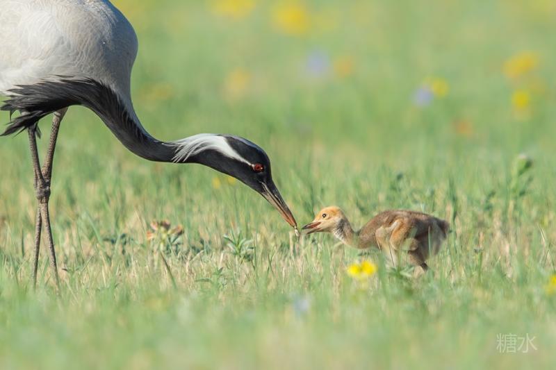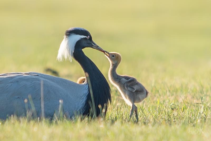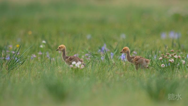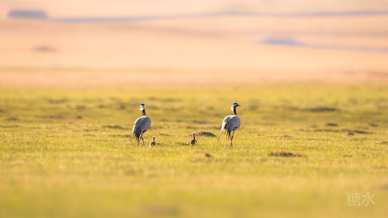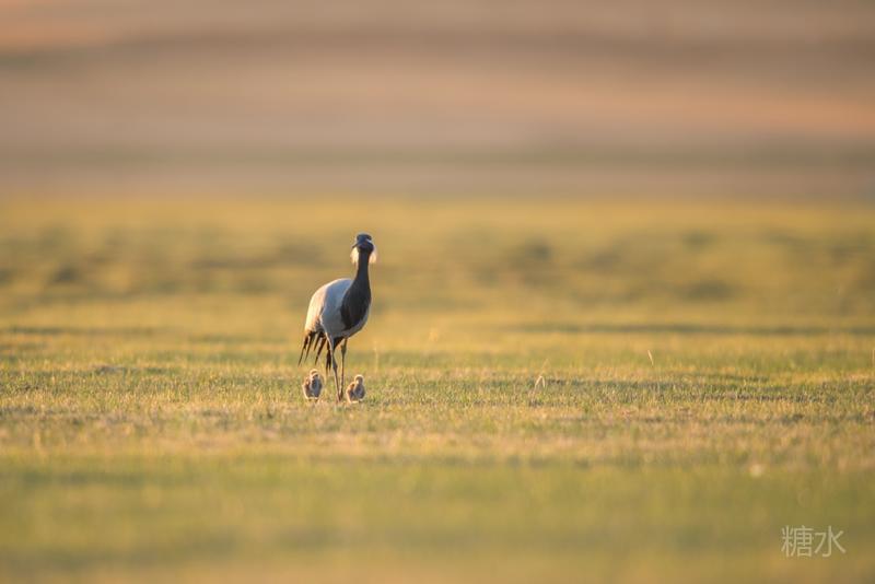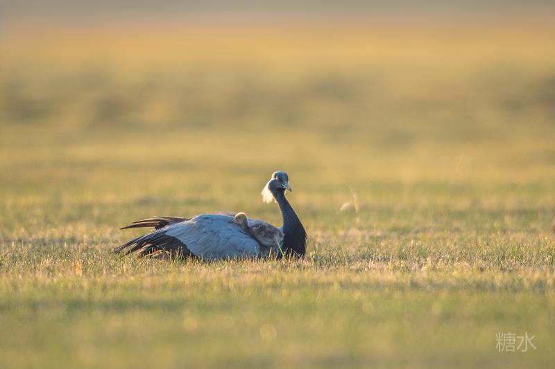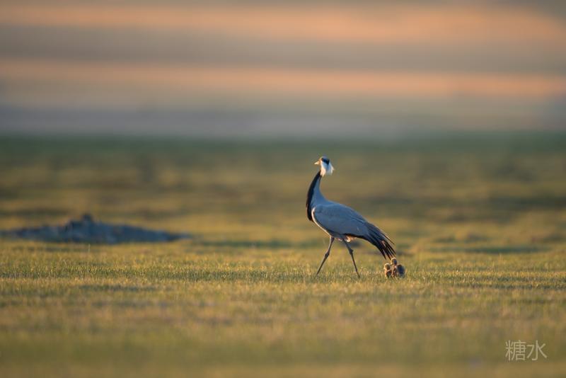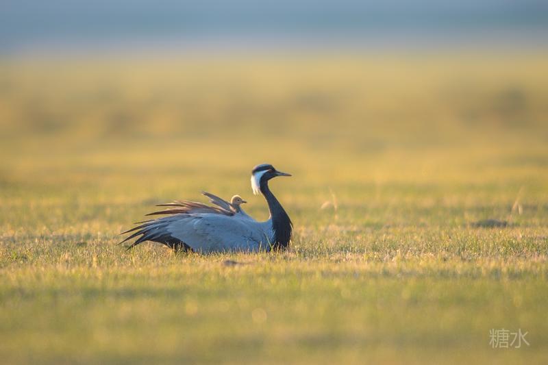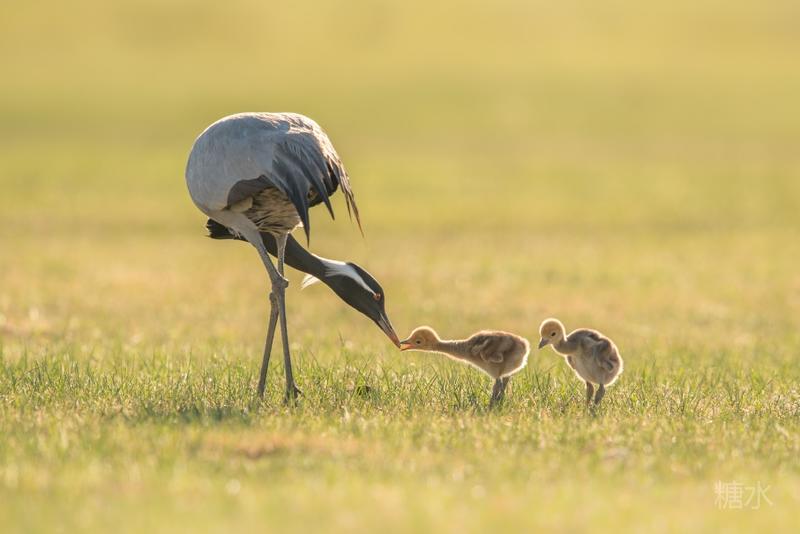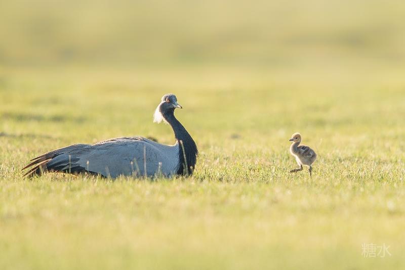 六月中旬蓑羽鹤幼鸟出壳,在父母的陪伴下蹒跚学步,在草丛中觅食。