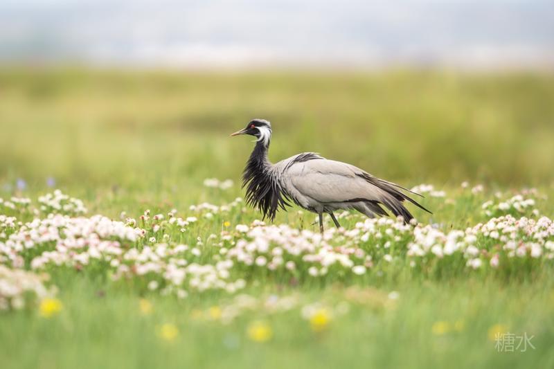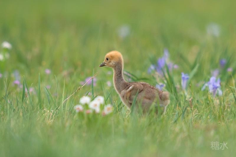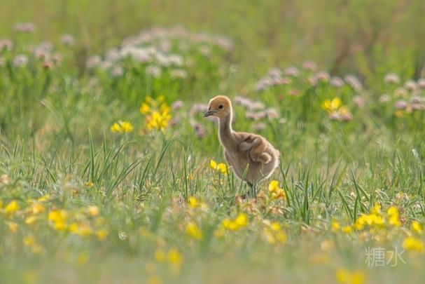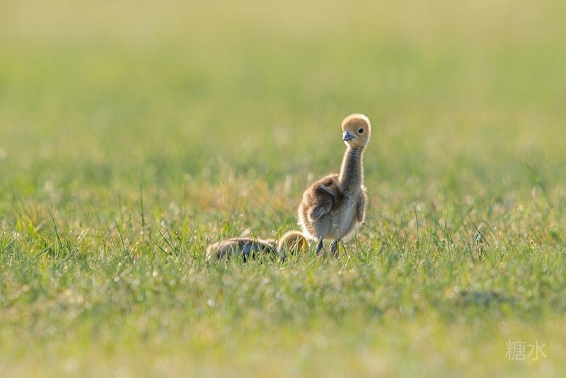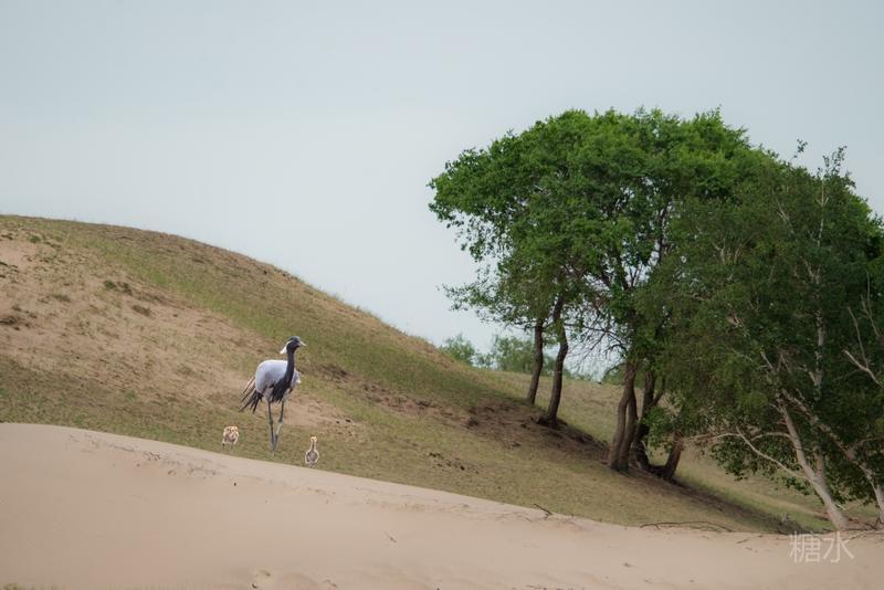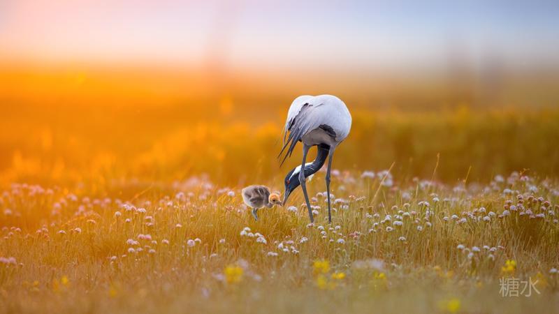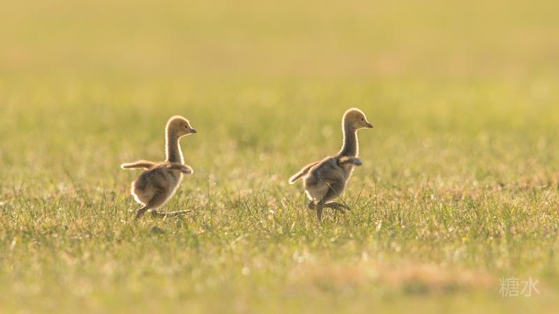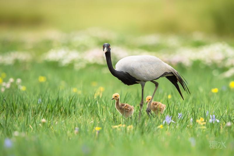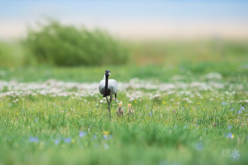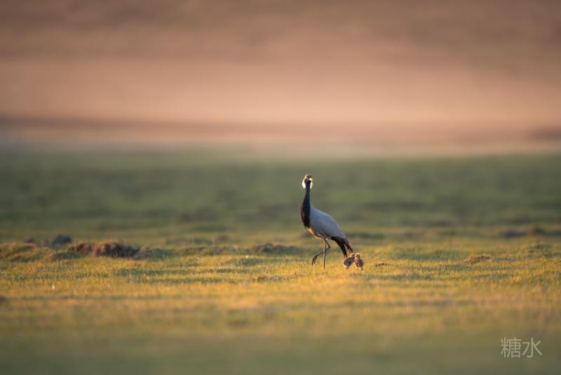六月中旬蓑羽鹤幼鸟出壳,在父母的陪伴下蹒跚学步,在草丛中觅食。