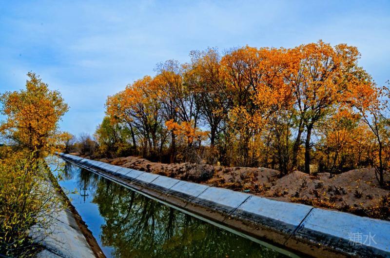 位于夹河乡大坑沿村的沙漠边缘有一片约100亩地的胡杨林,,由于靠近农田,长势良好,约有几百棵.