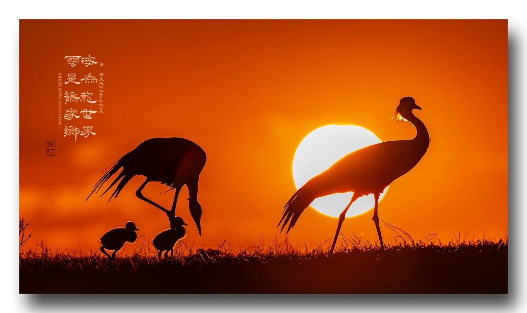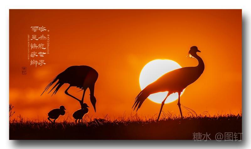 夕阳下,逆光,低机位,把蓑羽鹤突出在空中。 使用相机追焦,一直跟随蓑羽鹤一家,就等它们走进太阳。当相机取景器中一片耀眼的金黄,什么都看不清时,激动地按住快门,连续的拍摄,得到这些来之不易的美图,保留住这__瞬间的永恒。