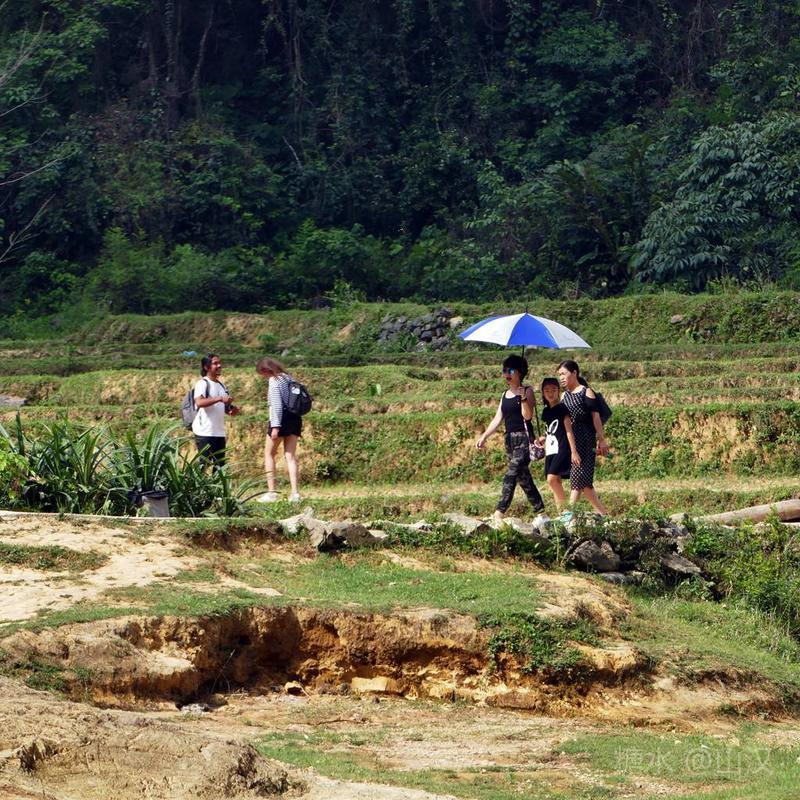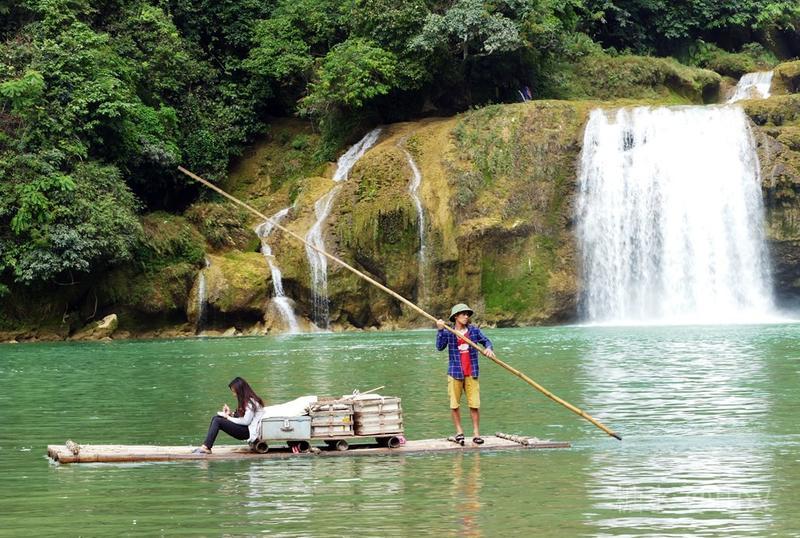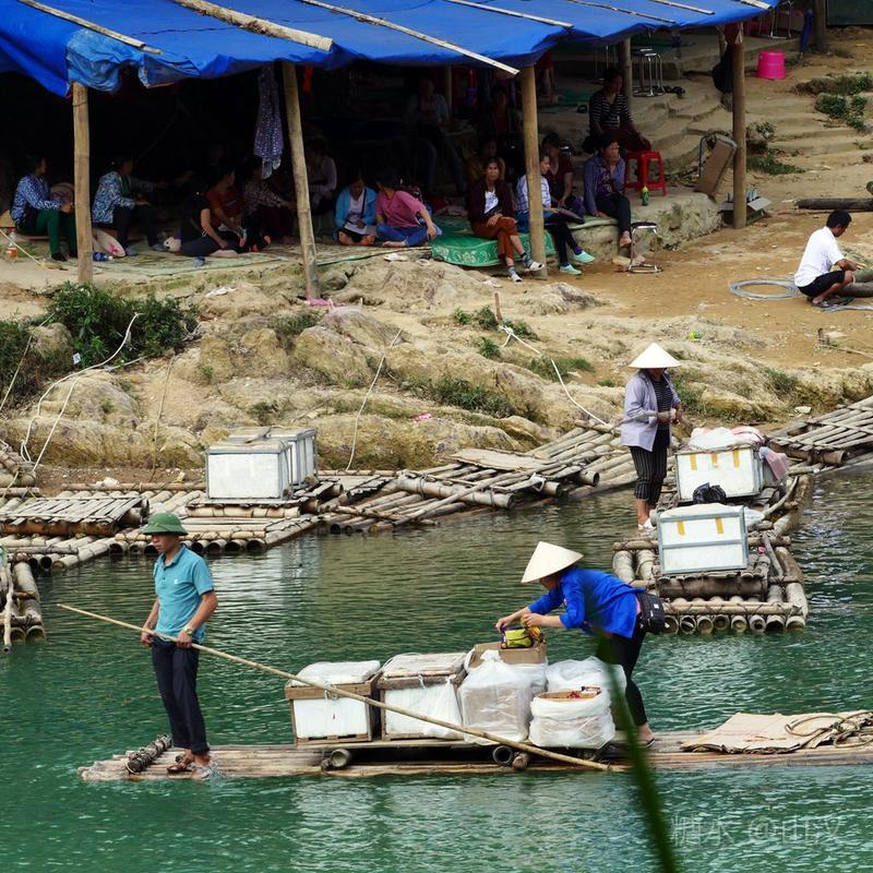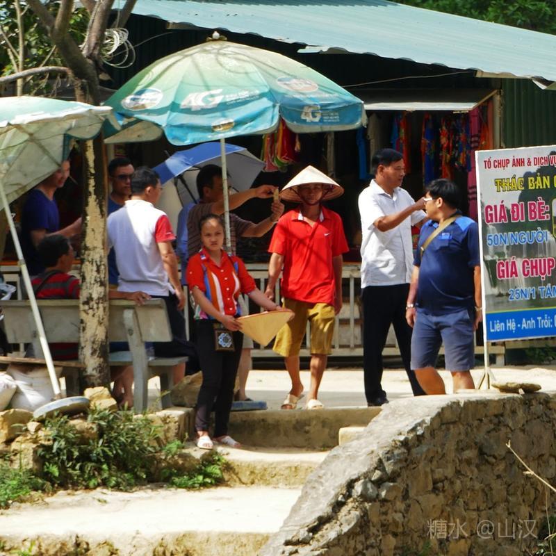 中越边民在瀑布的下游,进行着边贸往来,从对岸撑着小竹排过来卖东西的 越南 边民有很多,他们有的就蹲在小路上,有的就站在 水上 的竹排上,用他们并不熟练的简单的中国普通话在兜售越南小商品,倒是充满边境风情。