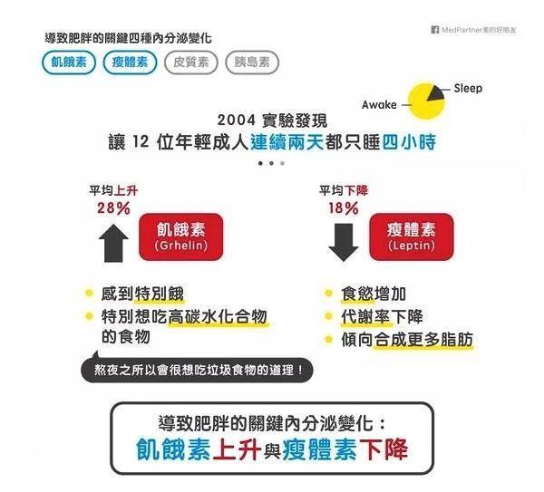 大部分肥胖者都有瘦素抵抗(Leptin resistance),身体肥胖+瘦素抵抗,身体内瘦素虽然很高,但大脑感觉不到,简单的来说就是大脑一直觉得饥饿。 这就是为什么有些人越来越胖,对吃有更多渴望的原因,换句话说人体并非缺瘦体素,而是对瘦体素有阻抗作用。 影响瘦素的因素 该如何改善? 瘦素的的对手是饥饿素,当双方攻守平衡时,我们就会摄入所需的热量,并且适可而止,当受到各种因素影响,它们会失去平衡,糟糕的是,当瘦素处于弱势时,我们的瘦身计划就无望了,所幸,与饥饿素的短期发作不同,瘦素是长期发挥作用的,提高体内的瘦素含量和敏感度,可以从建立健康的生活方式入手。 睡眠不足 很多人都认为熬夜会变瘦,事实上,熬夜不会消耗脂肪,当你经常睡眠不足时,瘦素会下降,饥饿素会上升,忍不住嘴,宵夜就下肚了,睡得愈久,瘦体素就愈高,相反睡眠时间愈少的人,平均体重就愈高,你有没有发觉当睡得不够的时候,第2天特别想吃东西来弥补,尤其是高脂肪、高糖分的食物,这就是瘦体素释放不够的原因。