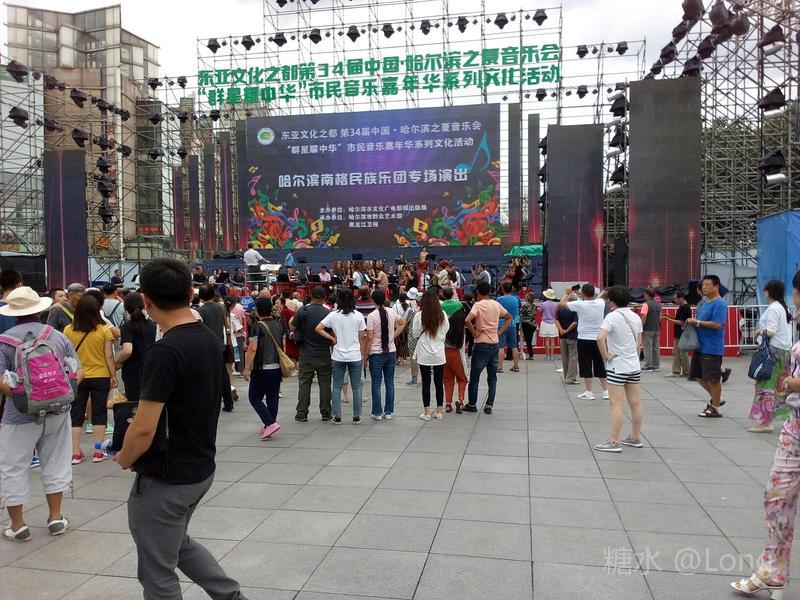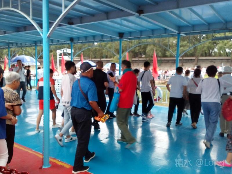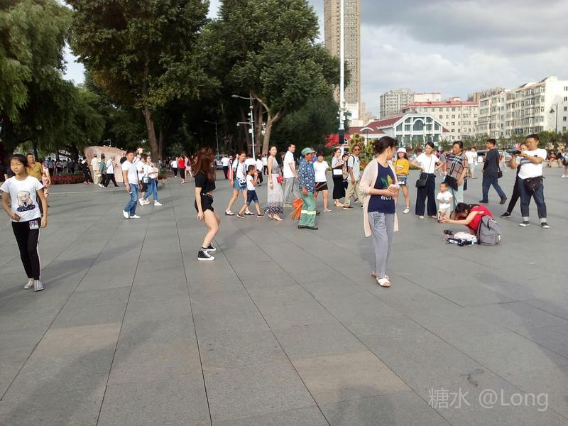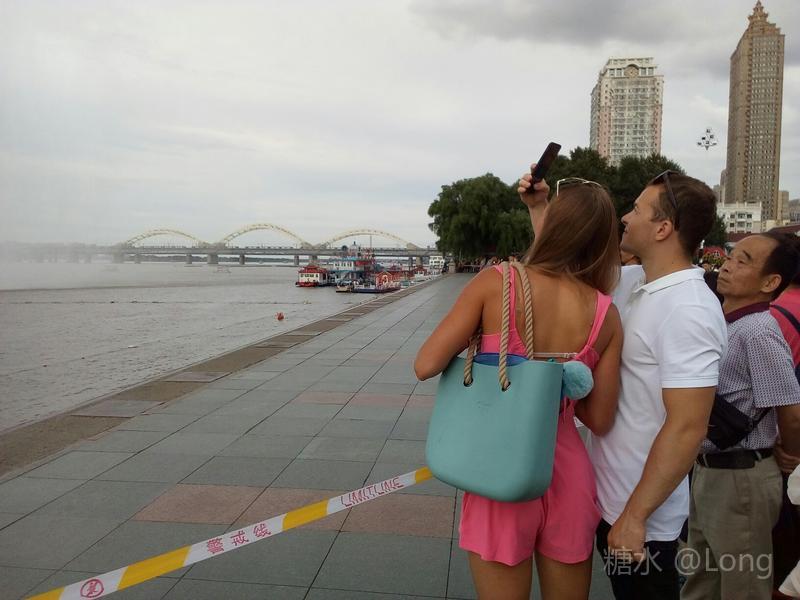 松花江边看喷泉的人们。看喷泉后我们准备到松花江铁路大桥游览,可是路过游船码头的时候,有人提出要乘游船游江。