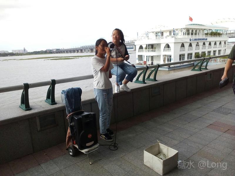 防洪纪念塔广场边上的舞台,大型民乐合奏正在彩排。