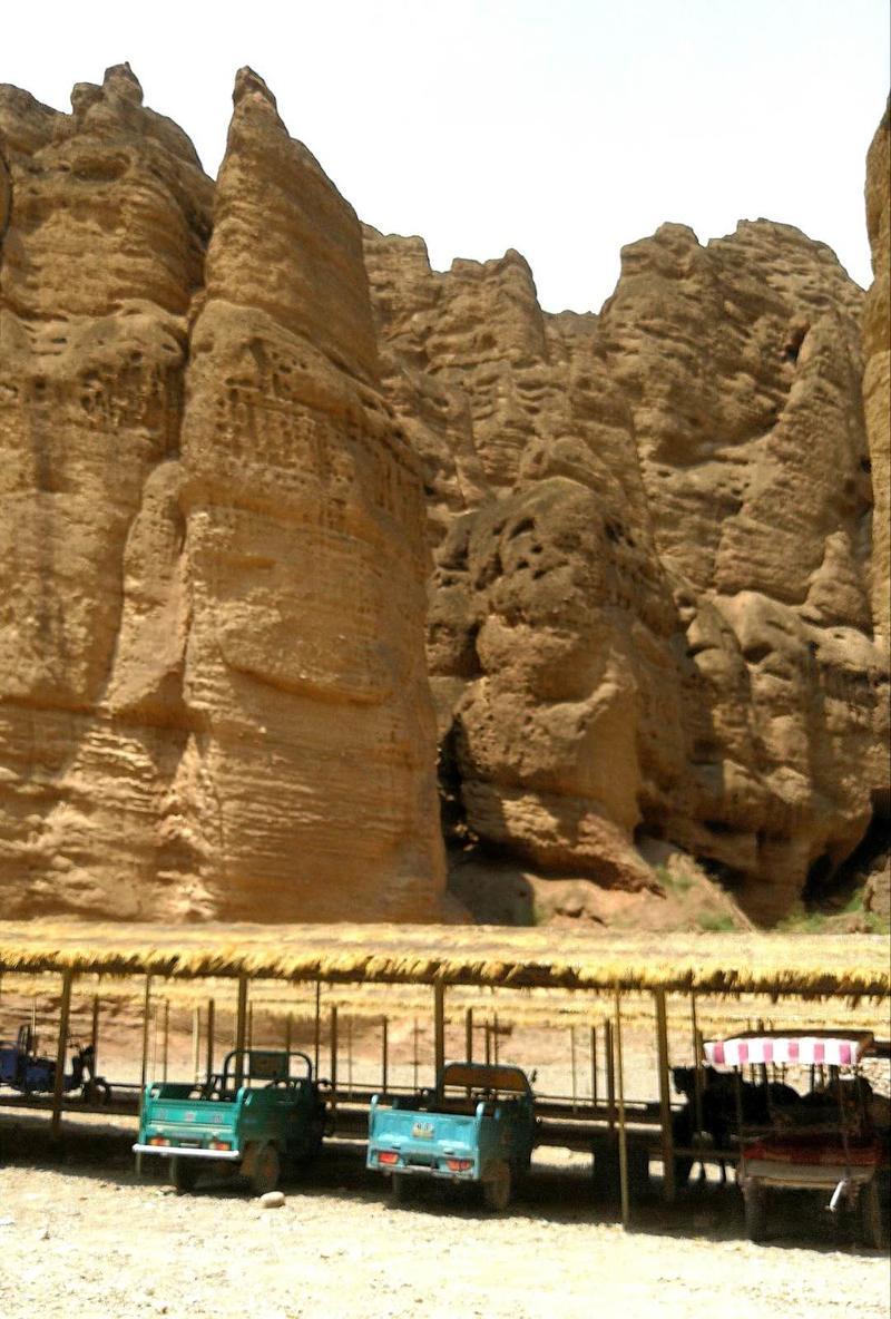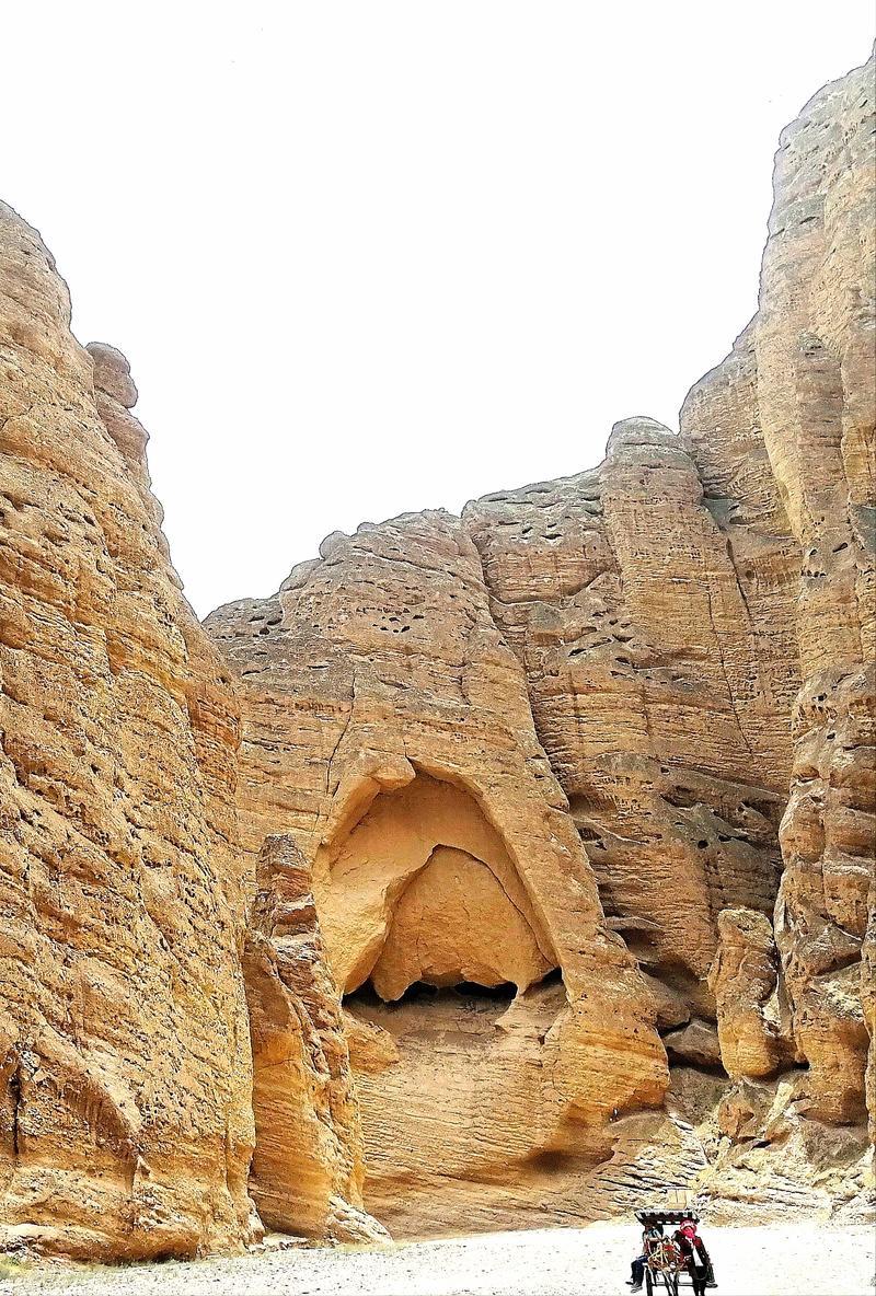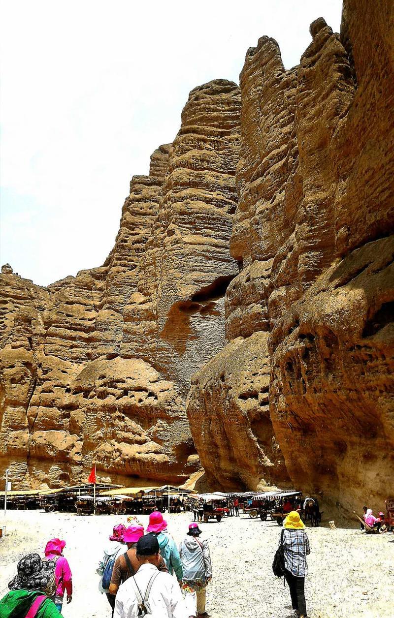 长长的“驴的”车队,拍成一字长蛇阵,向大峡谷进发。此时的饮马沟大峡谷的众多石林,像一群粗旷彪悍的西北壮汉们,裸露着锗黄色的皮肤,在等待着我们。