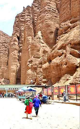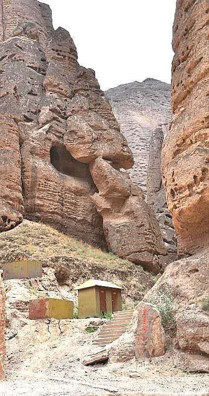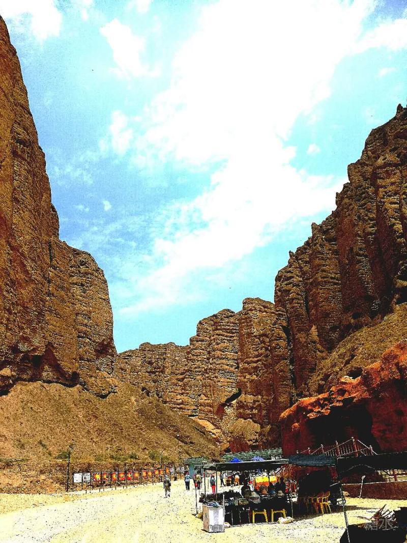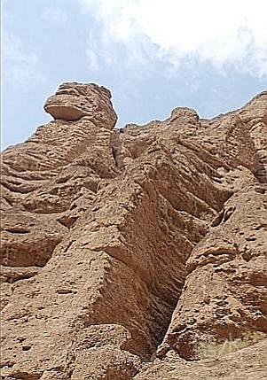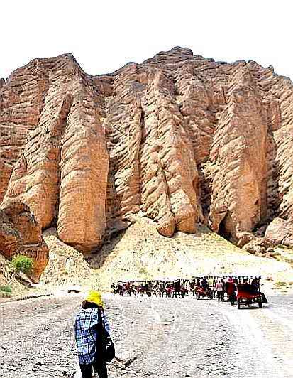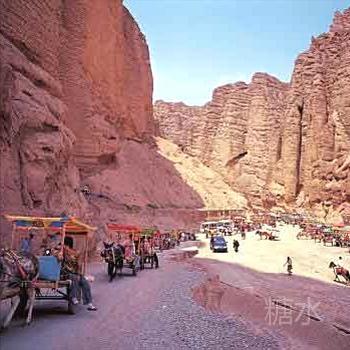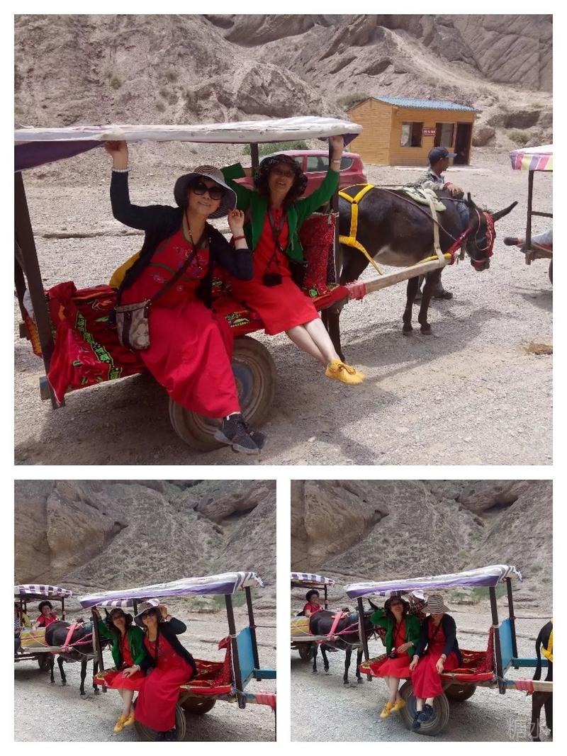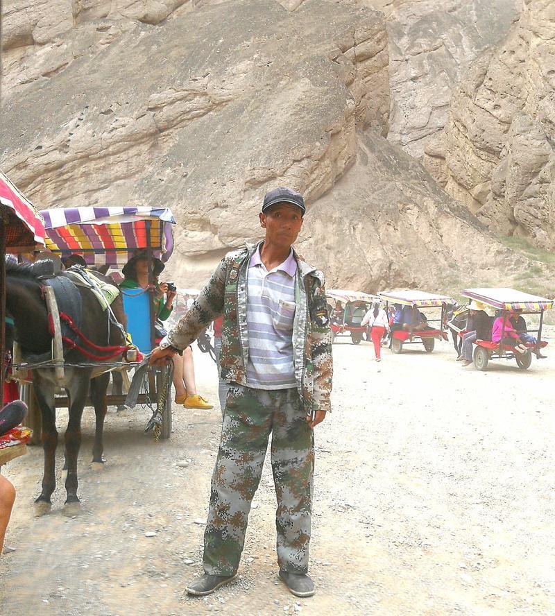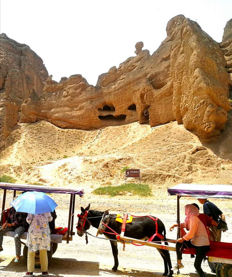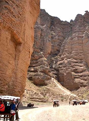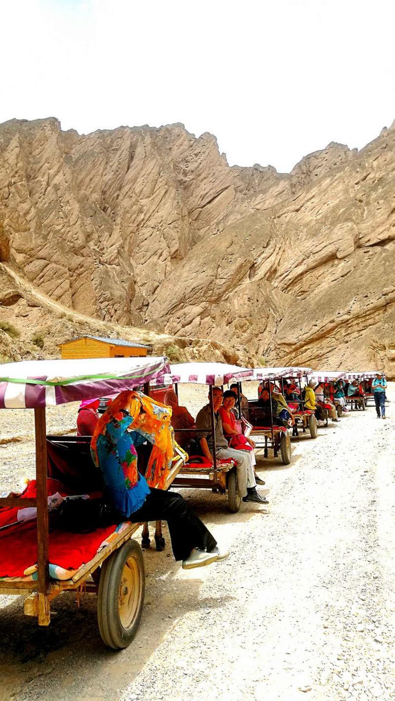 三人乘坐一“驴的”,“驴的”师傅多数是典型的西北妇女。她们一边走一边指点着途经的一个个奇崖怪石,用浓重的当地口音给你作着介绍。我们问她们什么,她们也都直率的回答。通过交谈,我们得知她们都是周围几十里的农民,按照规定的日期来饮马沟拍队等待游客,一般一天只能等上一趟,挣上百十元钱。