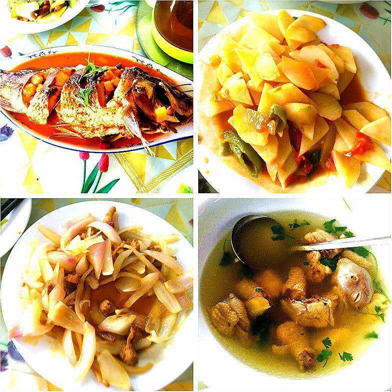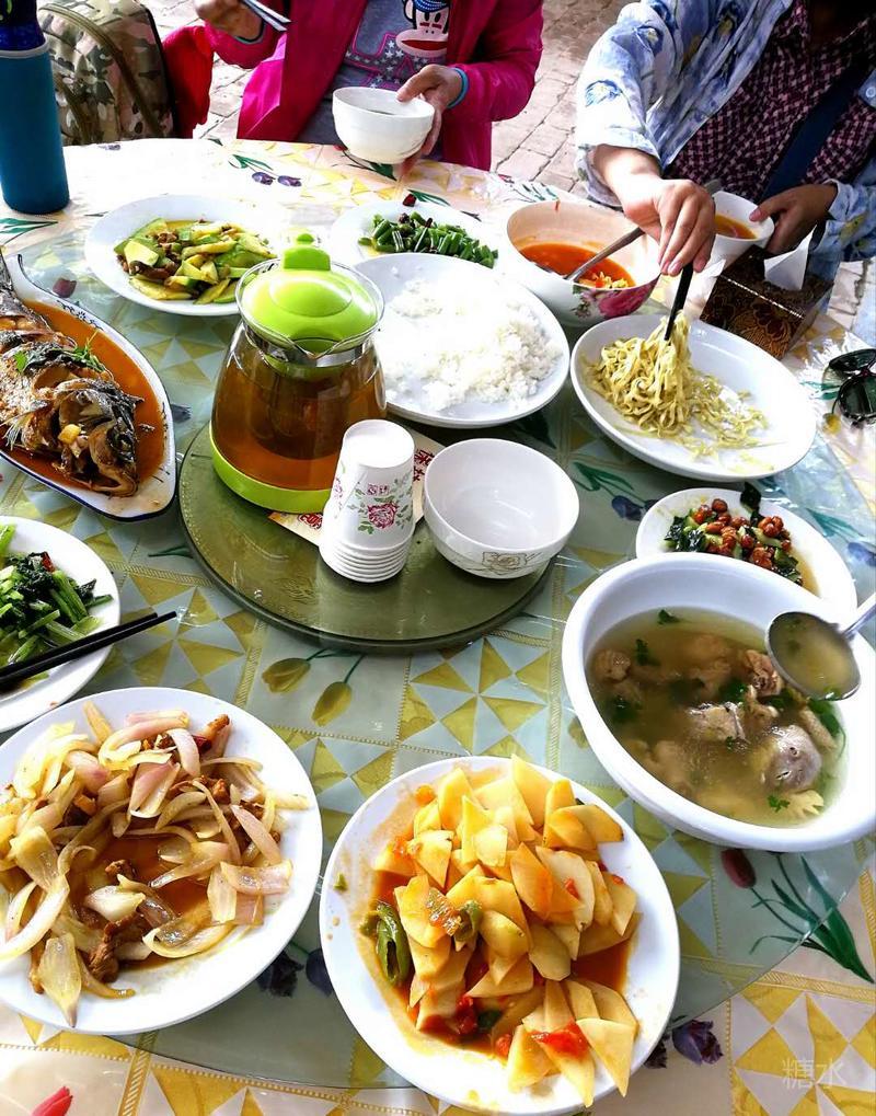农家乐,有鸡有鱼,有蔬菜、米饭、水果,全是健康的农家饭,大家反映还是挺可口的呀!