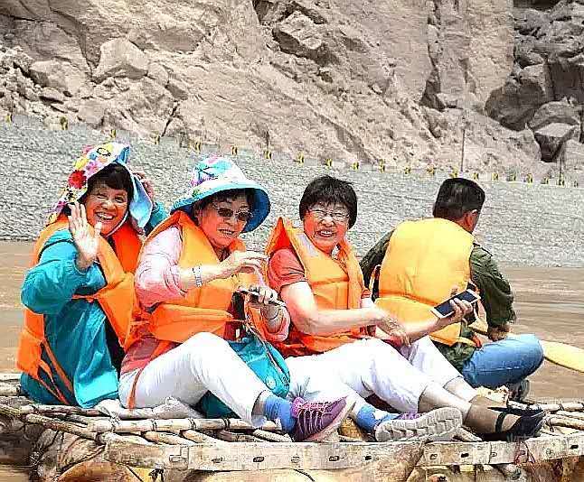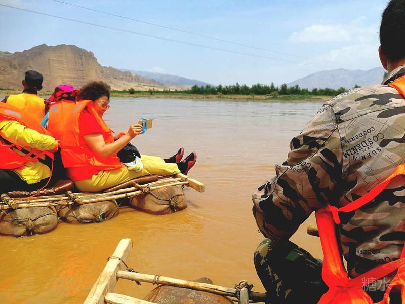 呵呵,十三或十四个羊皮捆绑制成的木筏子停靠在龙湾村的码头上。“必须穿好救生衣,每筏限乘3人...”。看过乘坐羊皮筏子的注意事项后,我们登上筏子。感谢筏子师傅的提醒,我们把手机放好,防止掉入黄河后的尴尬。