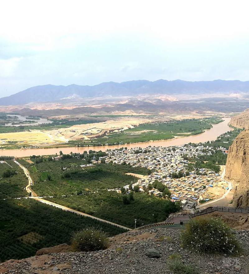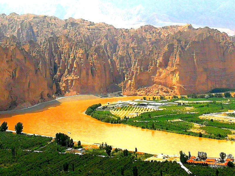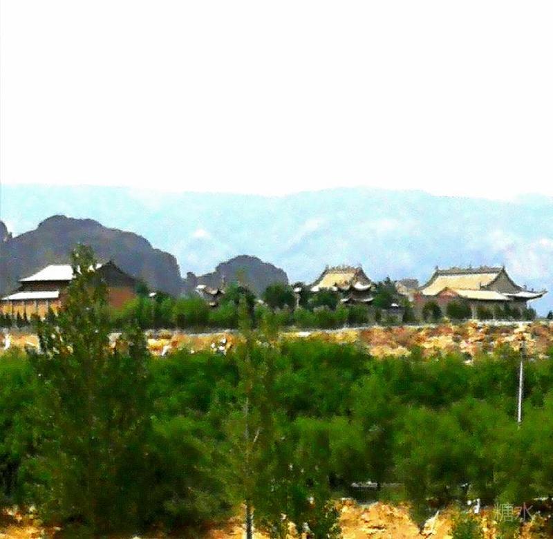 隔黄河望去,对岸沙滩曾是黄河故道,但现在却呈现一片绿树成荫的绿洲,许多黄瓦覆盖的宫殿屋顶在绿洲露出。那里就是座落在黄河沙坝里的清凉寺。