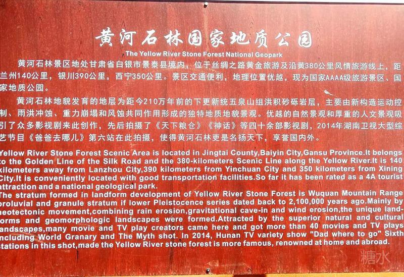 从资料获得,我们要游览的景泰县黄河石林国家地质公园,总面积约50平方公里,其中古石林群10平方公里。2007年甘肃省景泰县黄河石林风景旅游区顺利通过国家评审,被国家旅游局批准为4A级旅游景区,国家级地质公园。