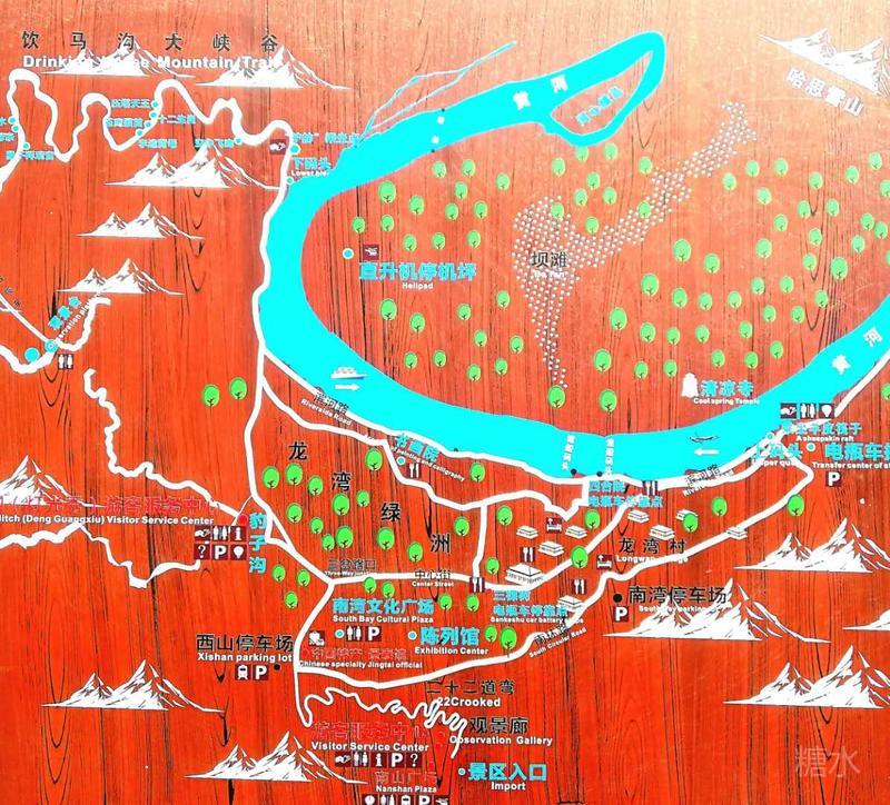 很快,几百米的高度下来,景区小巴车到了西山停车场了。放眼望去,空荡荡的停车场看不见一般景区外的那种拥挤,仅我们几辆大巴而已。因为以后就是在河岸平地上行驶了,于是我们在这儿又换乘景区的电瓶车继续前行。