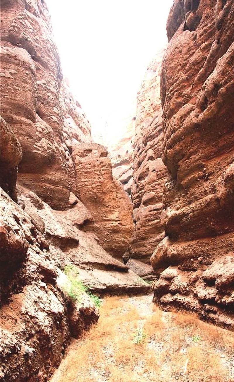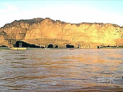 羊皮筏子顺流到下游约3公里时,前方左岸凌空的陡崖出现一道山口,山口两侧山峰陡峭,阳光下闪着金黄色的光芒。